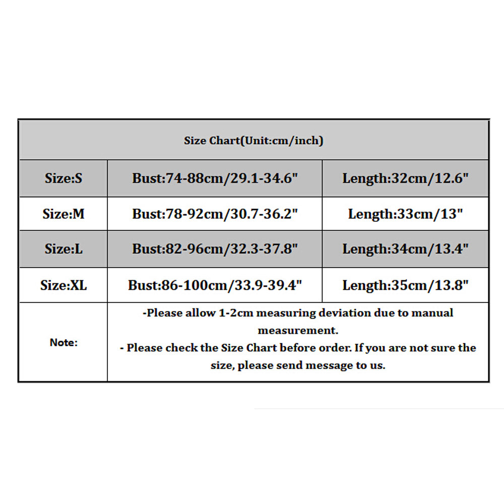 Размер: S Обхват груди: 86 см/33,86 дюйма Длина: 38 см/14,96 дюйма Размер: M Обхват груди: 92 см/36,22 дюйма Длина: 39 см/15,35 дюйма Размер: L Обхват груди: 98 см/38,58 дюйма Длина: 40 см/15,75'' Размер: XL Обхват груди: 104 см/40,94 дюйма Длина: 41 см/16,14''