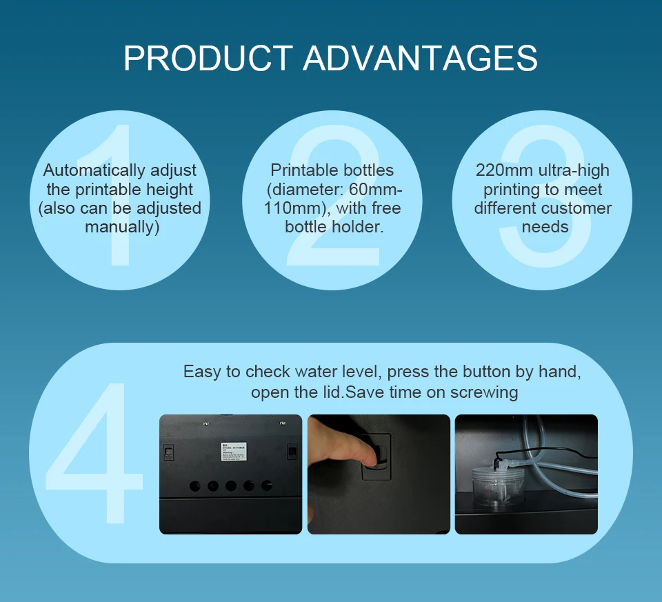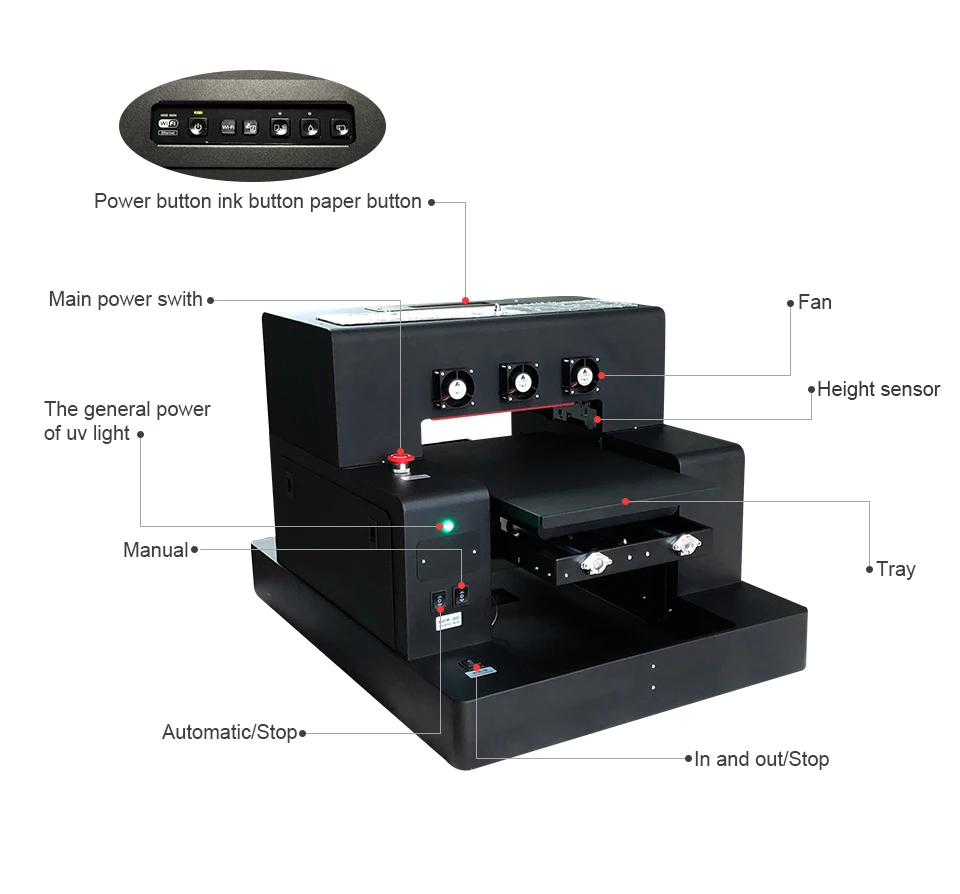 Specification: 1.Printing Methods: Micro Piezoelectric Print head as required drop of ink 2.Nozzle equipped: Total 1440 3.Print Size: A3+500mm*279mm(L*H) 4.Color: 8 Colors 5.Machine Size: 880mm*630mm*520mm(L*H*W) 6.Work size (tray pulled out): 1320mm*630mm*520mm(L*H*W) 7.The Minimum Amount of Ink Droplets: 1.5 PL 8.UV/Textile Printing Thickness: 60mm 9.Machine Feet Wide: 550mm,can place on 1200mm*600mm desktop 10.Printing Height Adjustment: Knob to control the height of the tray 11.Power Supply: AC 220/110V 50/60HZ 12.Maximum Print Resolution: 5760×1440DPI(Smart transform Droplet Technology)