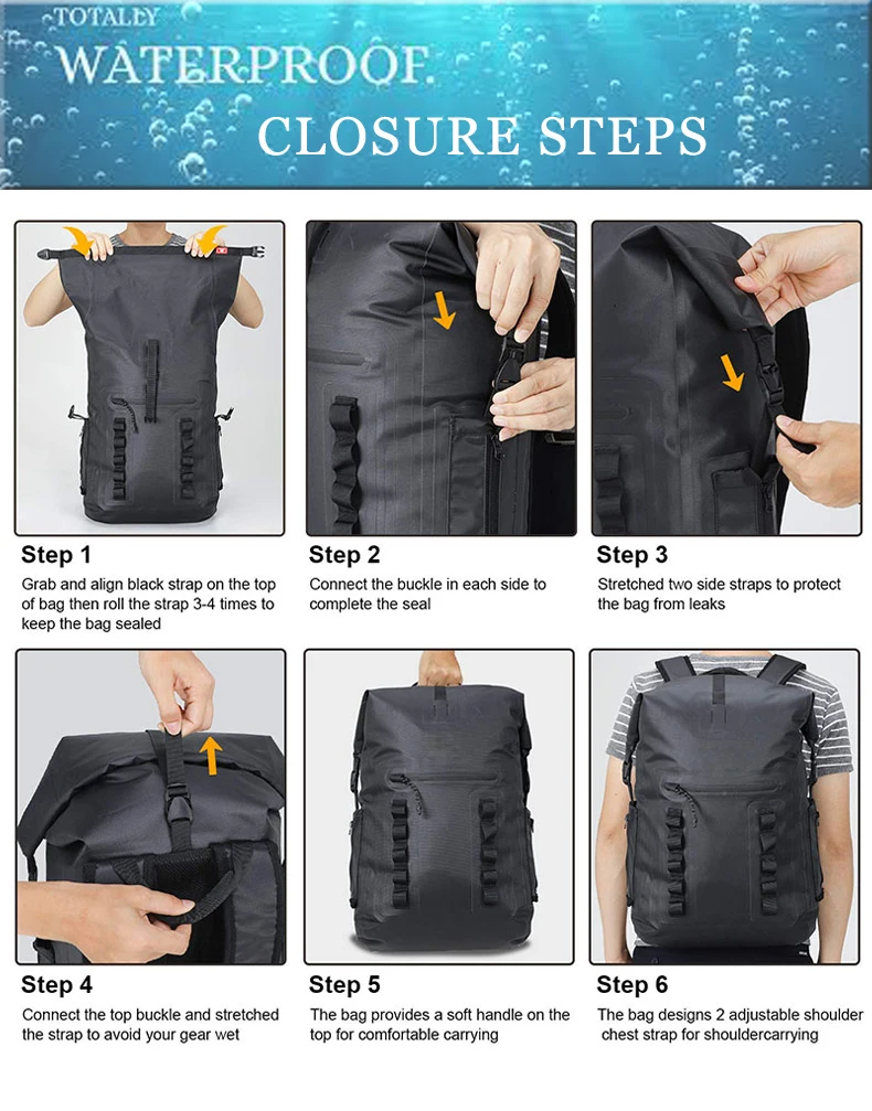 500D ПВХ материал имеет жесткие сварные швы, которые построены, чтобы быть водонепроницаемыми. Внешний карман защищен от брызг и идеально подходит для хранения ключей и удостоверения личности. Это помогает сделать этот рюкзак полностью защищенным от атмосферных воздействий практически для любых условий на открытом воздухе.