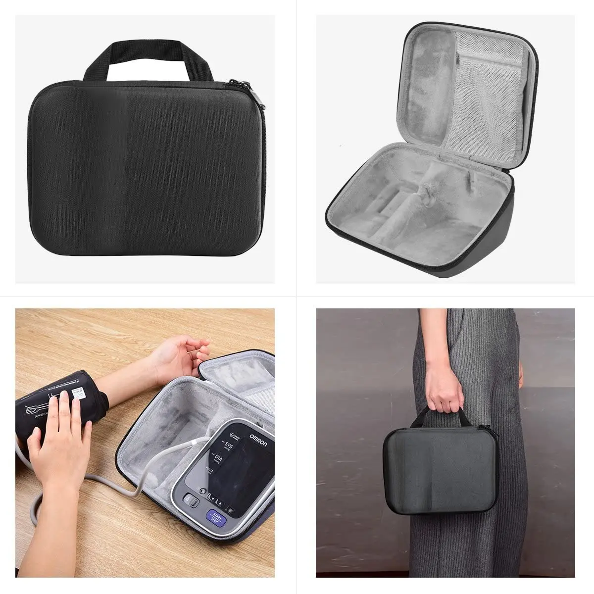 Details Colour: BLACK Material: EVA External Size: 10 x 4.3 x 7 inches Description FITS FOR 10 SERIES WIRELESS UPPER ARM BLOOD PRESSURE MONITOR with Cuff that fits Standard and Large Arms with Bluetooth Smart Connectivity.(not include the 10 Series machine.) WITH 2 CABLE CUFF : You can use and charge your 10 series without take it out, more convenience WITH CHARGER CUFF : Fits the omron perfectly and provide excellent protection SOFT INTERIOR: Shockproof layer,with internal super soft velvet to avoid any damages or scratches caused by accidentally bumping,dropping or pressure. HARD SHELL:The hard travel carrying bag is made of premium hard EVA. It provides excellent protection and a long-lasting performance for your blood pressure monitor. High quality and ultra durable carrying case with strong zipper. Compatibility: Perfect fit for 10 Series BP785N / BP786 / BP786N Wireless Upper Arm Blood Pressure Monitor Cuff Also fits 5 series and 7 series, but with some extra space Product Features: 1, Sturdy zipper, longer longevity 2,,With cable cuff and charger cuff, you can use and charge your without take it out 3, Hard EVA material. Durable Exterior and Soft Interior 4, Shockproof skidproof and semi-waterproof, keeps 100% safe 5, Soft interior ensure your Blood Pressure and accessories are protected well. 6, Noble fashionable appearance, lightweight and extremely durable 7,You can put the small accessories you need in internal mesh pocket.7, Perfect for a ideal gift to someone who has an Blood Pressure Monitor. Product DetailsMaterial: HI-Q Hard EVA and FlockingDimensions: 10in* 4.3in* 7inWeight: 10.6 ounces Package include 1* Hard Shell Carrying Case for Blood Pressure Monitor After-sale service: 365 DAYS SATISFACTION MONEY BACK SERVICE (For any reason, you're not satisfied with the product, return it back and get full refund or a replacement).