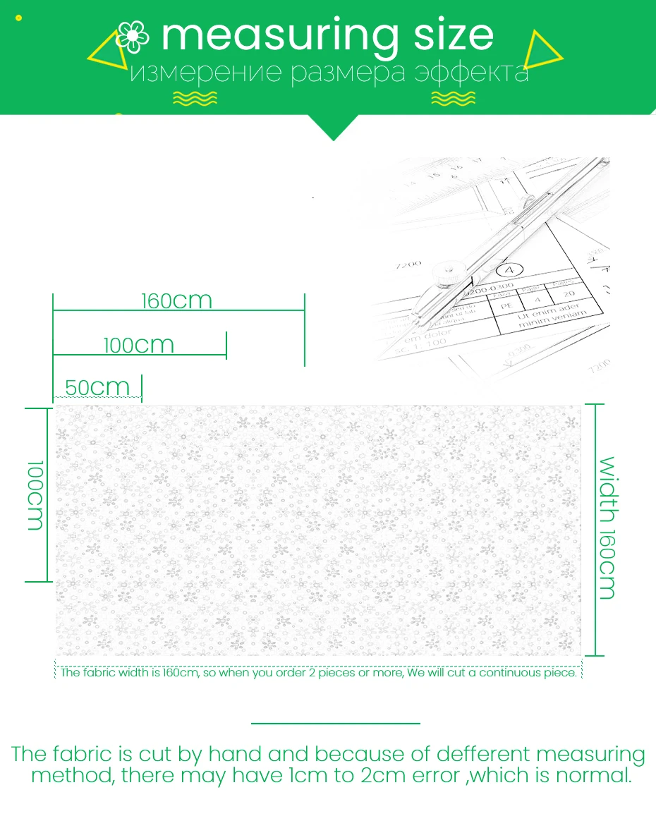 50x100 см, 100x100 см имеют предварительно вырезанный размер, если заказывать 2 штуки или больше, он не является непрерывным. Для размеров 50x160 см и 100x160 см ширина ткани составляет 160 см. Таким образом, когда вы заказываете 2 штуки или больше, мы будем резать непрерывный кусок. Например: Заказ 1 шт 50x160 см, резка 50 см x 160 см (полметра) Заказ 2 штуки 50x160 см, вырезание 100 см x 160 см (один метр) Заказ 3 штуки 50x160 см, резка 150 см x 160 см (полтора метра) Заказ 1 шт 100x160 см, вырезание 100 см x 160 см (один метр) Заказ 2 шт. 100x160 см, резка 200 см x 160 см (два метра) Заказ 3 pieces100x160cm, резка 300 см x 160 см (три метра) И так далее... Обратите внимание, что ткань отрезана вручную, и из-за различных методов измерения может быть погрешность от 1 до 2 см, это нормально. Эти ткани отрезаны в соответствии с размером, но не с узорами, поэтому не можете убедиться, что все полные узоры будут включены