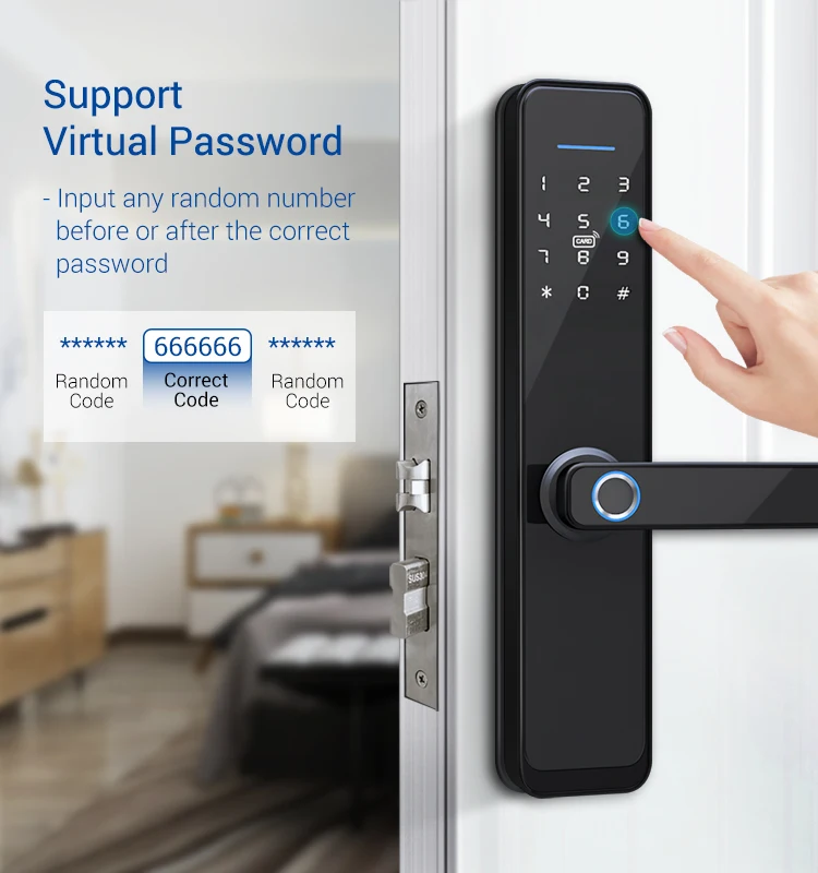 Aryclic Touch Keypad Password support 4-8 digitals Support the Anti-Peeping Virtual Password enter, Input the random passcode before or after the correct password, This makes your door much secured.
