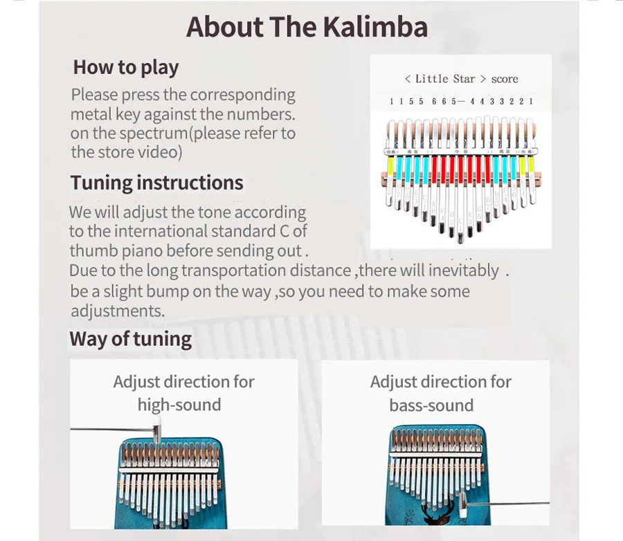 Подходящие люди: новички, высококлассное позиционирование, домашнее образование Количество клавиш: 17 Посылка 1x17 клавиш калимба, 1 x Обучающая книга, 1 х настроечный молоток, 1 х тканевый мешок, 2 x наклейки, 1 x двуязычная инструкция