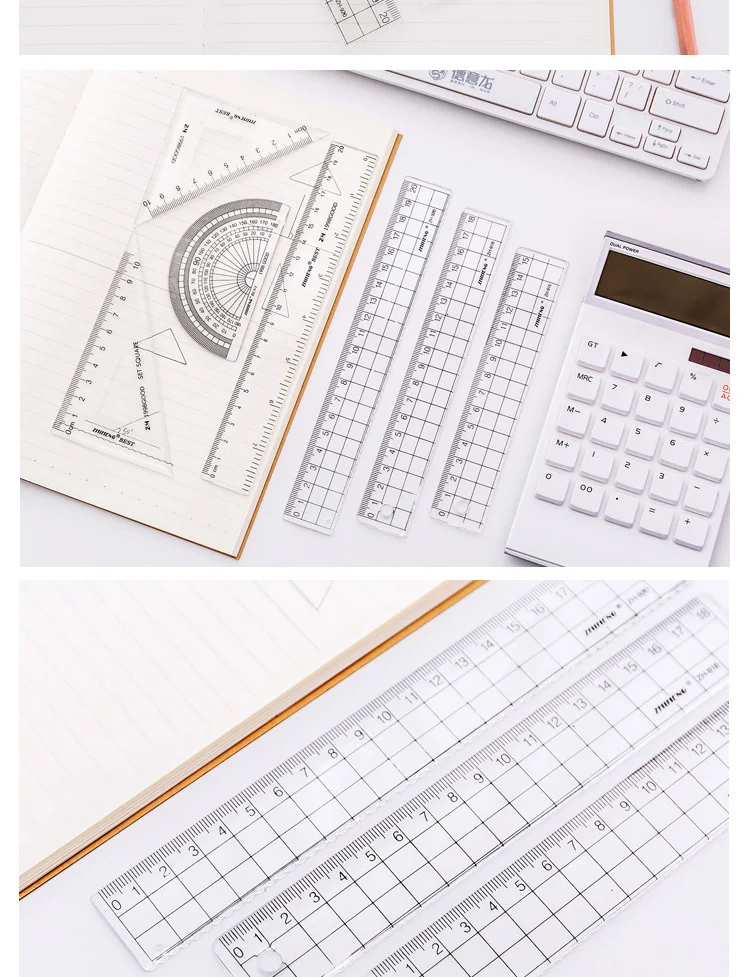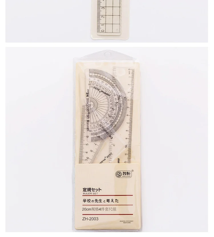 Набор 20 см включает в себя линейку 1 20 см, 2 тарелки с треугольниками и 1 транспортир.