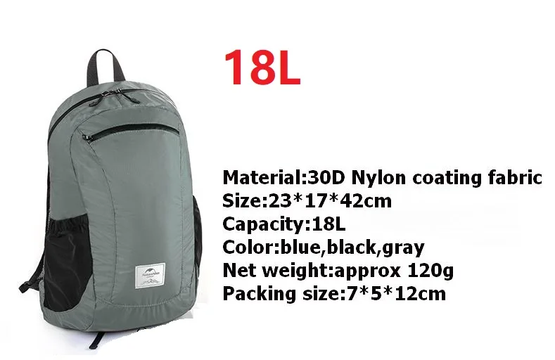 Бренд: Naturehike Материал: 30D нейлоновая ткань с покрытием Размер приблизительно: 23*17*42 см/19*26*48 см Емкость: 18л/25л Цвет: синий, черный, серый Вес нетто: около 120 г (18л)/172 г (25л) Размер упаковки: 7*5*12 см/8*18 см Характеристики: Сверхлегкий, складной, удобный для переноски, водонепроницаемый индекс 2000 +
