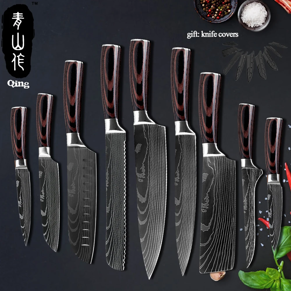 Handle material: color wood handle Blade material: Stainless Steel Knife handle design: bend handle Tips: The blade is 7CR17 stainless steel, the surface of the laser Damascus pattern, very beautiful, good workmanship, razor sharp, keep your kitchen away from the blunt knife, and enjoy your kitchen life!