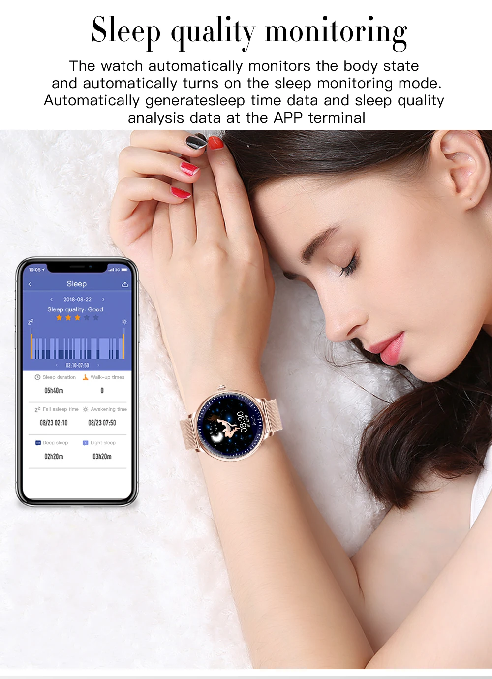 The watch automatically monitors the body state and automatically turns on the sleep monitoring mode. Automatically generatesleep time data and sleep quality analysis data at the APP terminal