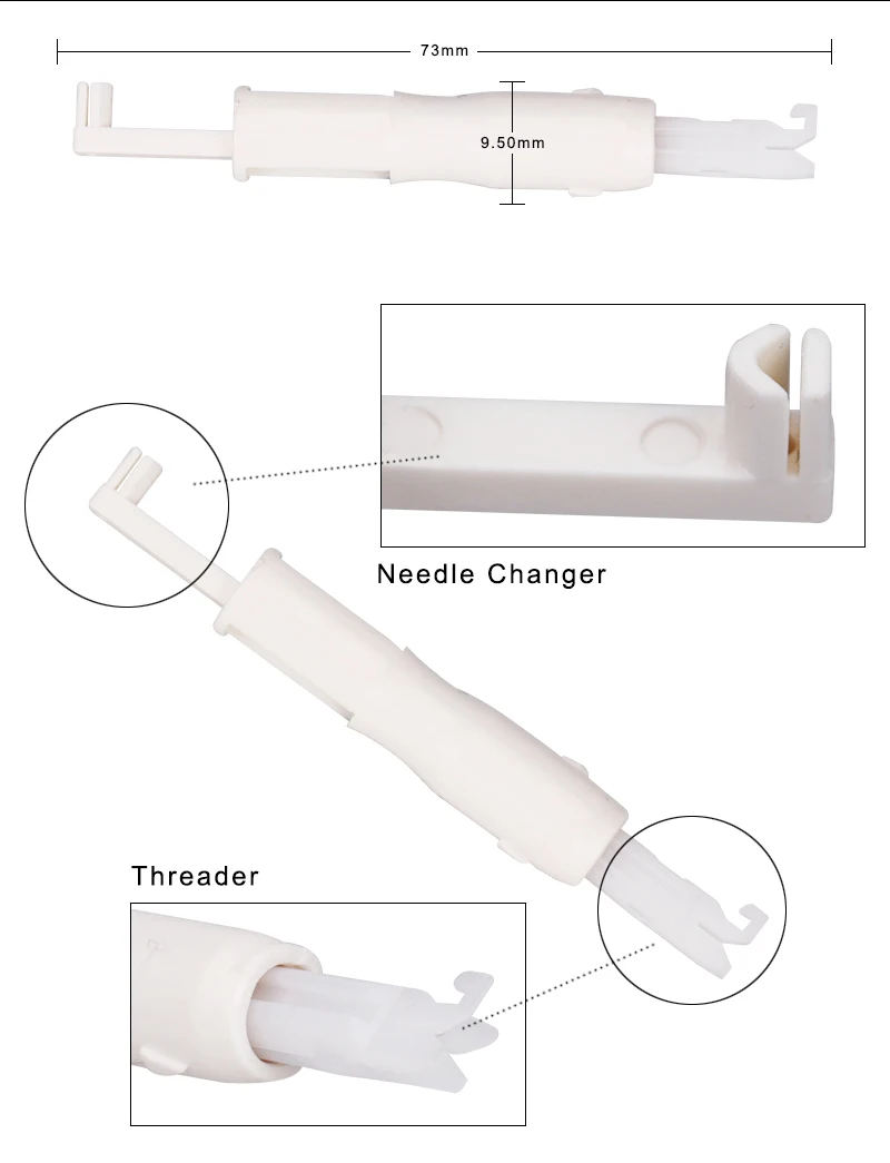 Для резьбы, это может помочь пройти нитку через игольчатый глаз удобно, в чехол с плохими глазами или плохим освещением; Для вставки, он надежно удерживает иглы, чтобы предотвратить падение во время смены игл.