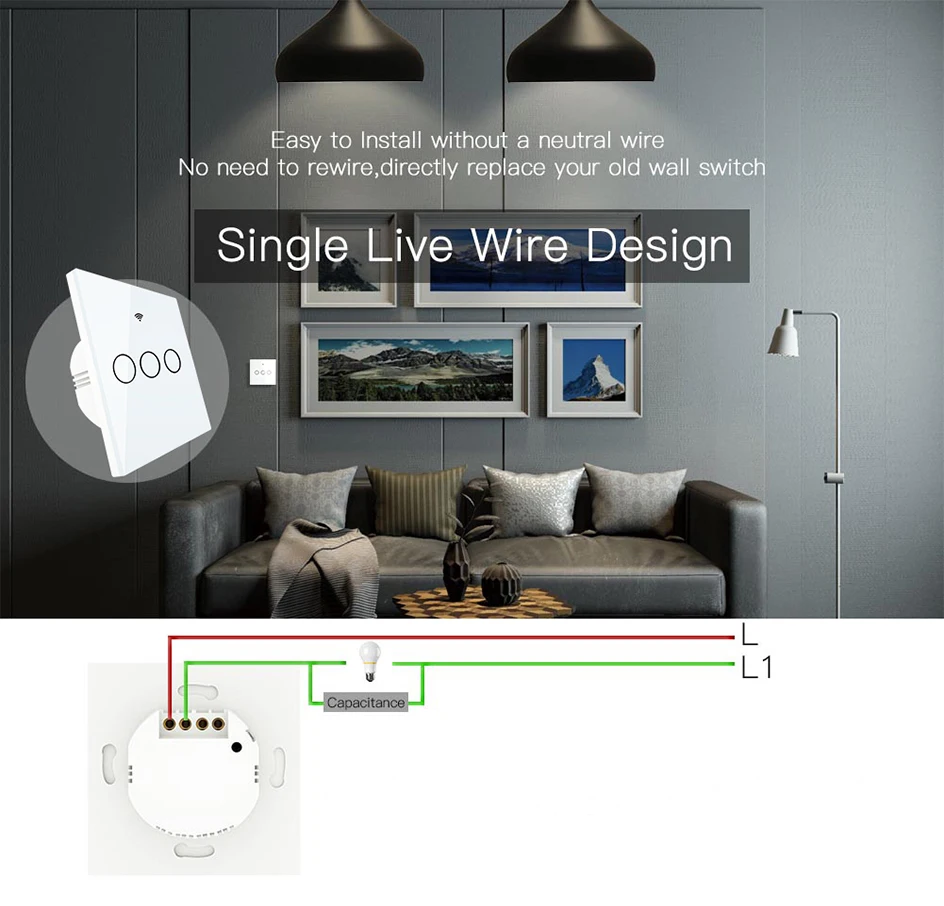 1.Не требуется нейтральный провод: Не требуйте нейтрального провода и его можно легко установить без переподключения имеющегося провода. Просто замените старые переключатели для работы с различными устройствами. И дажеУникальная панель из закаленного стекла подходит для различных стилей декора.(Внимание: Емкость должна быть подключена к обоим концам ламп для нормальной работы.)