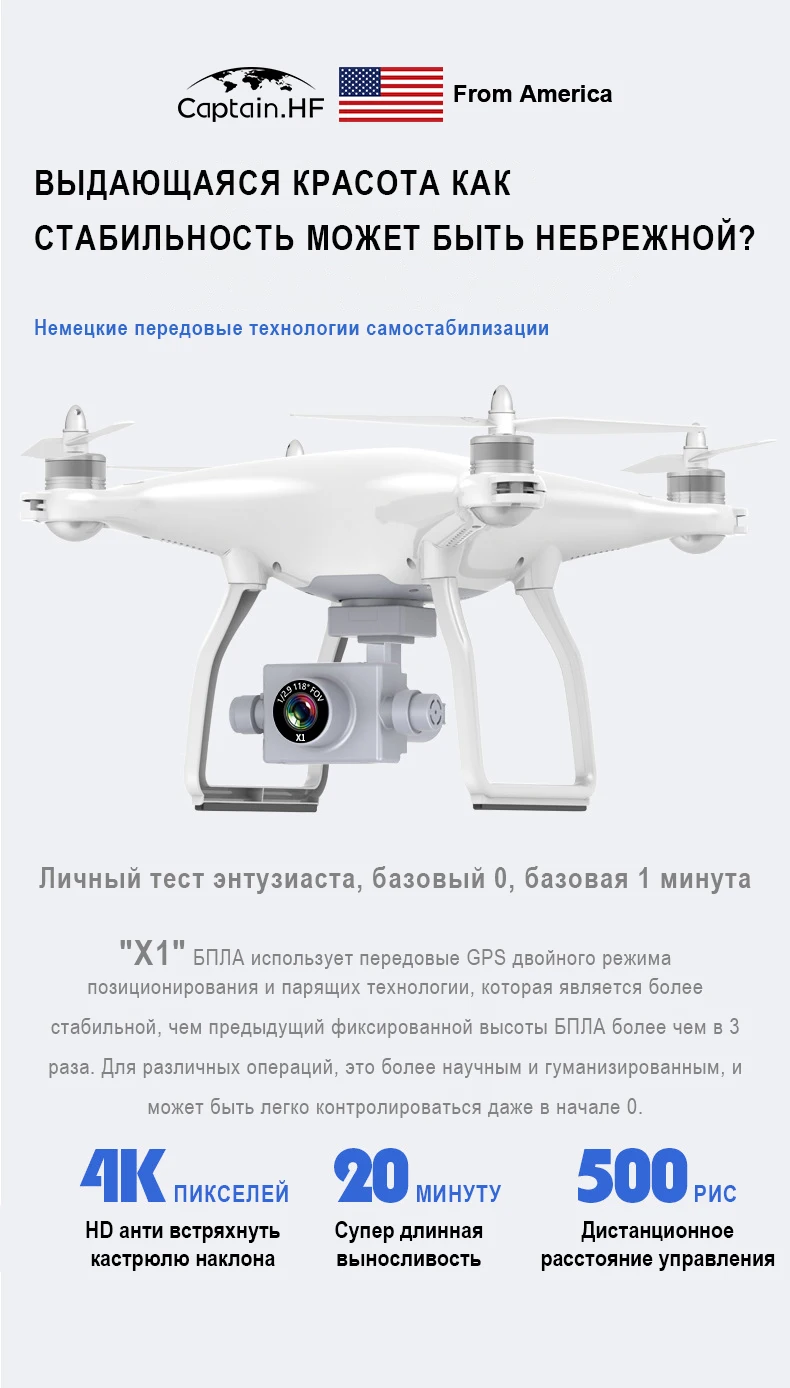 Дрон US Captain оснащен GPS-навигацией и функцией удержания высоты, которая идеально подходит для аэрофотосъемки. Широкоугольная камера 4k WIFI 1080P позволяет получать еще больше изображений в режиме реального времени для фантастической съемки видео / изображений, что действительно является отличной комбинацией для полета. Более того, это просто фантастика, благодаря функциям возврата в одну клавишу, «Follow Me» режиму и взлёта / посадки одной кнопкой. (Телефон на картинках не входит) Характеристики: Функции: полет вбок, поворот влево / вправо, вверх / вниз, вперед / назад, удержание высоты, взлет / посадка одной клавиши, режим «следуй за мной», WiFi FPV, GPS, G-сенсор, широкоугольная камера 1080P, один возврат ключа, крутой светодиод Широкоугольная камера 4k WIFI 1080P позволяет получать еще больше изображений в режиме реального времени для фантастического видео / фотосъемки. Режим удержания высоты облегчает управление беспилотником для новичка и более стабилен для аэрофотосъемки. Режим позиционирования GPS обеспечивает более точный полет. С одной ключевой функцией автоматического возврата дрон может легко найти дорогу домой. Функция Follow Me позволяет дрону автоматически следовать за оператором во время полета. Используйте план полета на кончиках ваших пальцев, просто нарисуйте маршрут на экране, дрон будет автопилотировать в соответствии с заданным путем. Управление Wi-Fi позволяет осуществлять передачу видео в реальном времени, подключив мобильное приложение к беспилотному Wi-Fi. Мобильные телефоны с системой IOS или Android доступны. Характеристики: Название предмета: US Captain Дрон Пульт дистанционного управления: 2.4G 4CH Черный цвет Камера: 4K 1080P широкоугольный объектив Аккумулятор Drone: 7,4 В 2800 мАч Модульная липа Батарея пульта дистанционного управления: батарея 4 * AA (не входит в комплект) Размер продукта: 350 * 200 * 240 мм Вес продукта (включая батарею): 250 г Информация об упаковки: Размер упаковки: 35 * 20 * 24 см Вес упаковки: 1201 г / 2,6 фунта Там может быть некоторое отклонение из-за ручного измерения. Внимание! для батареи: Не перезаряжайте и не разряжайте батареи. Не кладите аккумулятор рядом с высокой температурой. Не бросайте это в огонь. Не бросайте это в воду. Примечание: Эта модель RC не игрушка и не подходит для детей младше 14 лет, держите ее подальше от детей. Внимательно прочитайте инструкцию перед любым использованием, если вы новичок, желательно помочь опытному взрослому. Список упаковки: 1 * X198 RC Drone 1 * Пульт дистанционного управления 1 * USB зарядное устройство 1 * 7.4V 2800mAh Lipo Battery 4 * Запасной винт 1 * держатель мобильного телефона 1 * Отвертка 1 * Руководство пользователя на разных языках (Великобритания, Франция, Германия, Испания, Италия)Заказывала месяц назад данную ботинку и, наконец то получила товар. Лакированные, элегантные ботики, и с размером тоже все порядке. Я... Читать отзыв полностью...