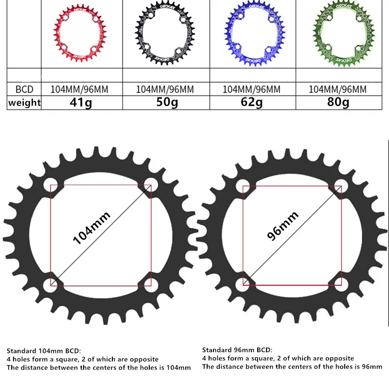 Бренд: DECKAS Тип диска: дисковые тормоза Цвет: черный, красный, синий, фиолетовый, зеленый, золотой Спецификация: 32T / 34T / 36T / 38T Вес: 41 г для 32T / 50g для 34T / 63g для 36T / 81g для 38T Применимый Кривошип: 104BCD Примечание: ссылка на зуб-это ссылка на диск, а продукты, требующие овального диска, можно приобрести по следующей ссылке: Овальный ссылка: Установка Примечания: 1. Вкд зубной пластины составляет 104. Купленный друг тщательно определяет, что его Кривошип составляет 104BCD (диаметр круга, образованного в центре четырех отверстий для ногтей диска, составляет 104 мм). 2. Отверстие для ногтей диска на этом диске имеет незатухающий дизайн, И гвоздь диска может непосредственно использовать три и два зубных гвоздя зубного диска, чтобы быть модифицированным без необходимости покупать один гвоздь диска.