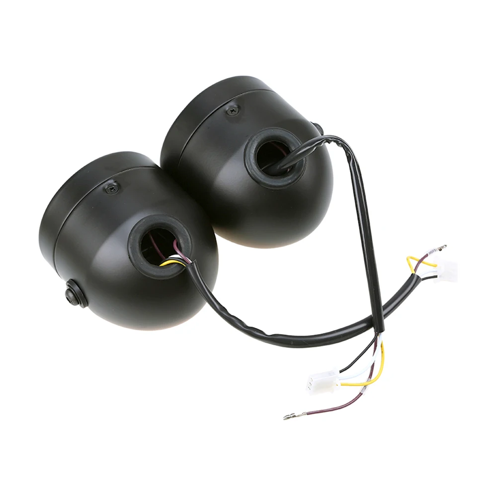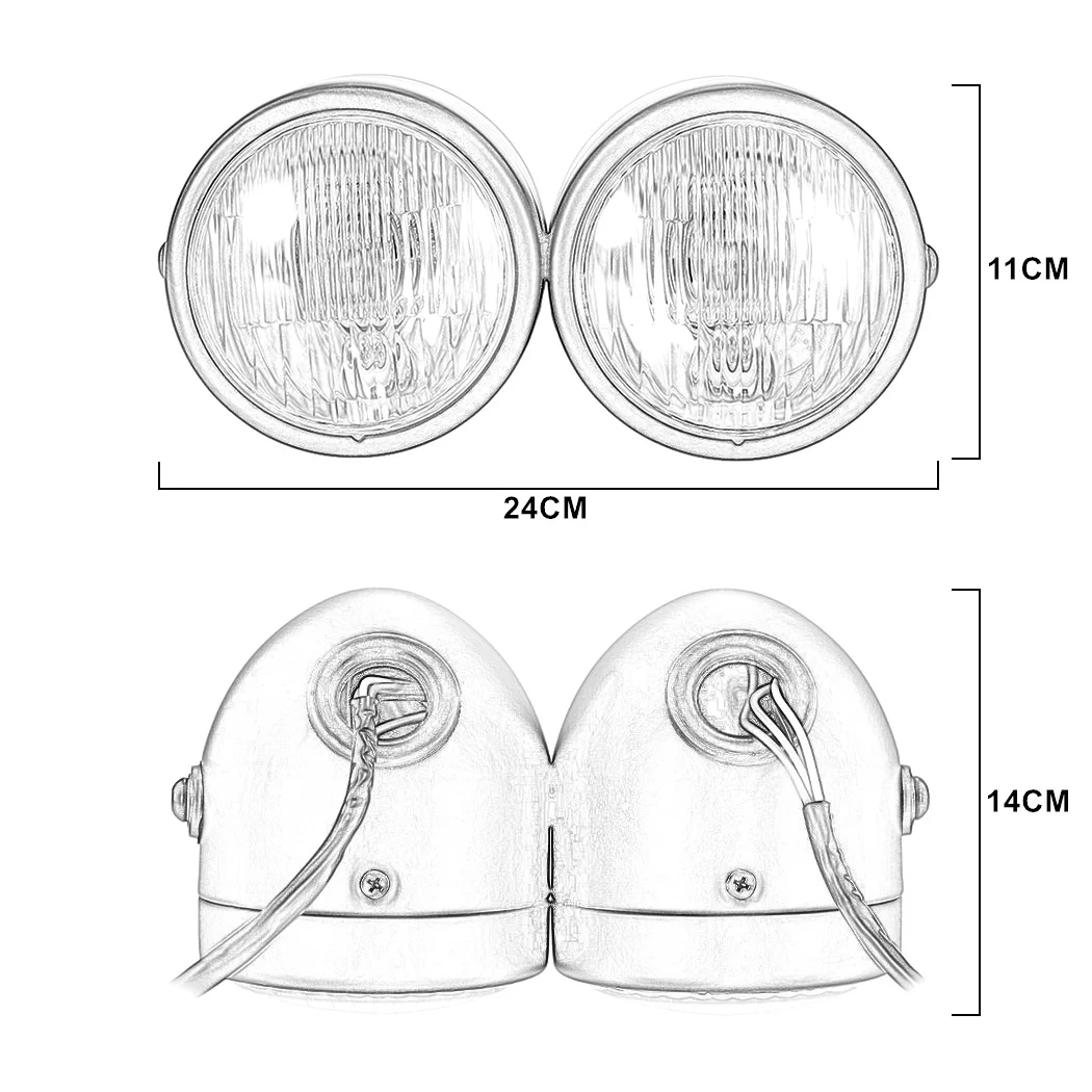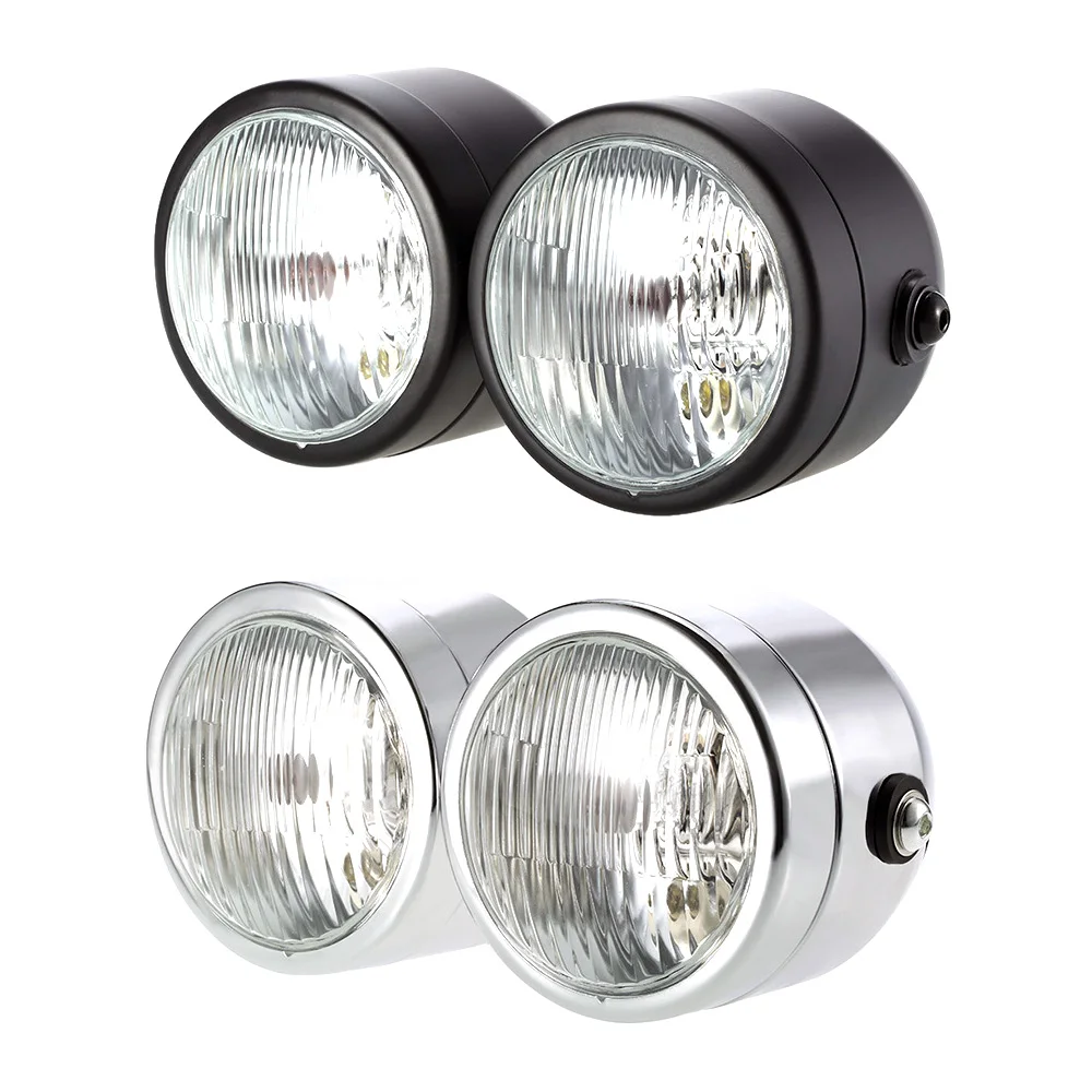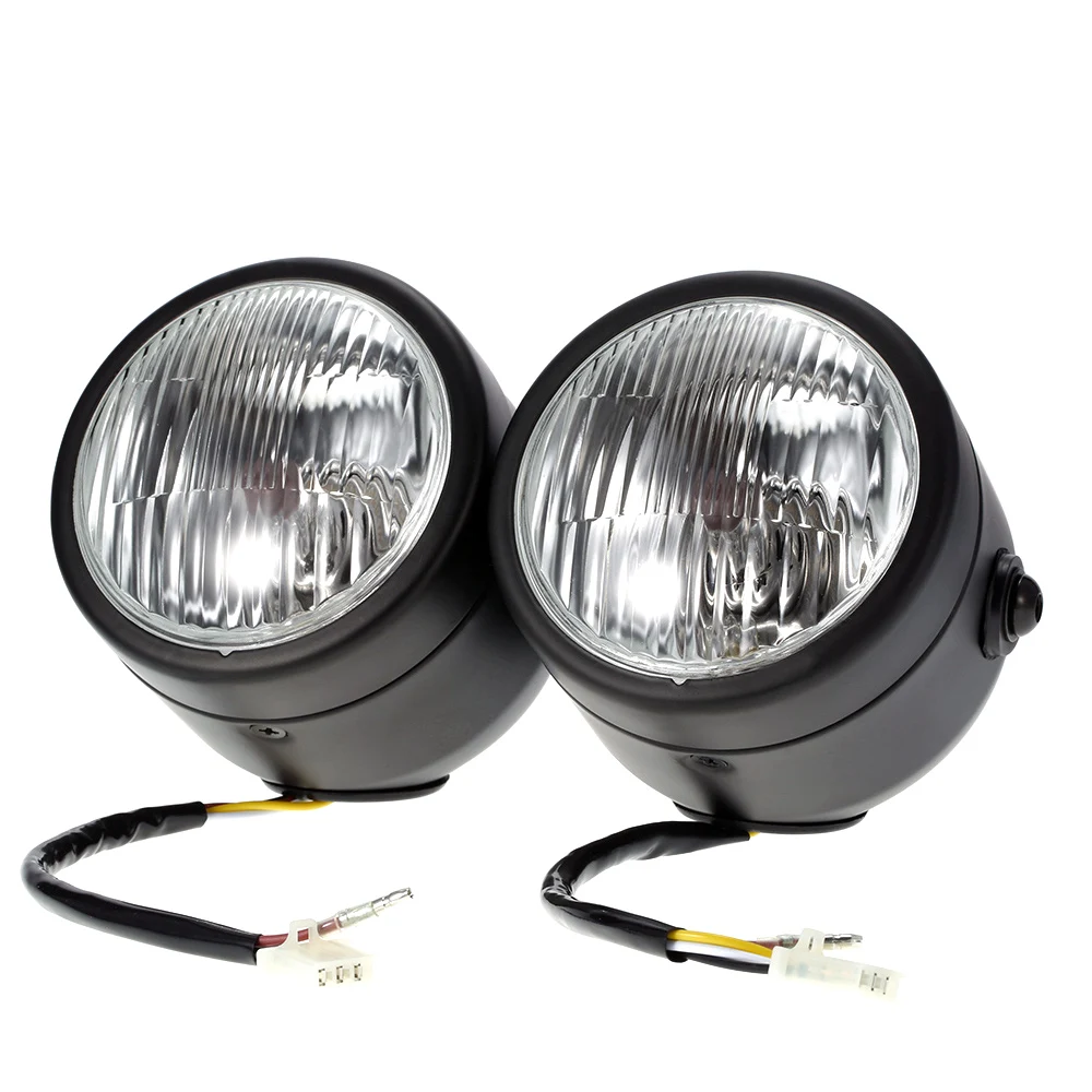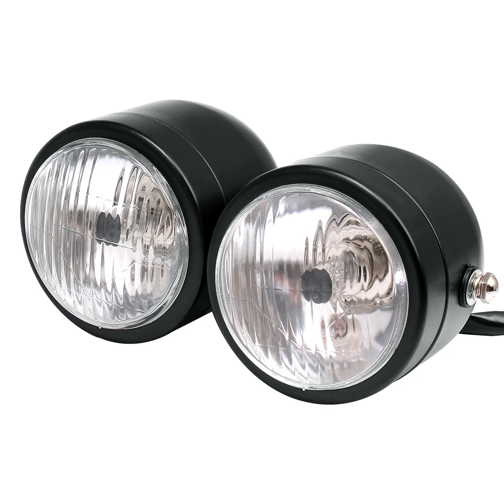 100% Новый бренд Полностью металлические ведра Стеклянные линзы Боковая установка Напряжение: 12 В DC Два H4 (35 Вт галоген) Освещение проводное параллельно, чтобы оба света могли работать как один Цвет: матовый черный/хром/1 желтый + 1 белое стекло Материал: высококачественный Железный корпус + стеклянные линзы