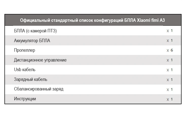 FIMI A3 – новая портативная модель квадрокоптера от двух производителей Xiaomi Corporation и FIMI Technology Ltd, набор характеристик и возможностей которого способен потягаться с популярным дроном DJI Spark премиум-класса. Одной из основных особенностей дрона является использование аналогового 5.8G FPV вместо Wi-Fi, как у большинства аналогичных коптеров. Основываясь на опыт предшествующих технических решений, разработчики смогли создать действительно достойного конкурента на рынке беспилотных летательных аппаратов по приемлемой цене. Внешний вид Дизайн дрона Xiaomi FIMI A3 минималистичный, в нём отсутствуют лишние элементы. При обзоре сверху можно увидеть красный логотип FIMI, остальные детали выполнены исключительно белыми. По качеству сборки квадрокоптера нет никаких нареканий, в этом он схож с устройствами другой известной марки DJI. Лучи у данного беспилотника, не складные. Взамен традиционных самозатягивающихся винтов на двигателях разработчики применили быстросъёмные разъёмы. Направление моторов обозначено красными стрелочками. Под крышкой аккумуляторного отдела квадрокоптера находится microUSB порт. Клавиша питания расположена на днище Xiaomi FIMI A3. С обратной стороны под заглушкой имеется шести контактный DIY-порт. Производители предоставляют три способа его применения: светодиодная подсветка; запал электронного типа для поджигания фейерверков; сервопривод. Для полётов в вечернее и ночное время суток на каждом луче Xiaomi FIMI A3 предусмотрены RGB-светодиоды. При этом DIY-порт позволяет самостоятельно увеличивать число светодиодов и производить другие эксперименты с дополнительными устройствами. Комплект поставки Xiaomi FIMI A3 включает следующие компоненты: Квадрокоптер. Аккумулятор. Пульт с интегрированным FPV ЖК-дисплеем. Зарядное устройство. USB-шнур. Соединительный зарядный кабель. Три пары быстроснимаемых винтов. Руководство пользователя на английском языке. Конструкция Камера На борту квадрокоптера установлена 8 Мп FullHD камера с CMOS матрицей Sony 1/3.2 дюйма под управлением процессора Ambarella ISP. Угол обзора – 80 градусов, максимальный битрейт – 60 Мбит/с. Камера снимает видео с разрешением 1080р с 30 fps. Полученные записи сохраняются на карту microSD. Крепёж производится на механический 2-осевой кардный подвес, а стабилизация по трём осям осуществляется электронным способом. Полёт от первого лица (FPV) в беспилотнике Xiaomi FIMI A3 реализован на аналоговой частоте 5.8 ГГц через 40-канальный видеопередатчик. Изображение в онлайн-режиме транслируется без задержек на встроенный в пульт ДУ ЖК-дисплей диагональю 4,3 дюйма. Качество видеопотока – 480р, предельной расстояние передачи – 1 км. Управление Для управления Xiaomi FIMI A3 используется пульт ДУ с встроенным FPV дисплеем 4.3 дюйма, функционирующим совместно с аналоговым видеоприёмником. В нижней части пульта под резиновой заглушкой расположен microUSB порт для зарядки, гнездо AV-выхода, а также слот под флешку. На корпусе установлены две антенны: одна 2.4 ГГц для управления квадрокоптером, вторая 5.8 ГГц для видеопередачи в реальном времени. Батарея Дрон оснащён мощной интеллектуальной 3-х баночной (11.1В) литий-полимерной батареей. Ёмкость составляет 2000 мА*ч. Максимальная длительность полёта на одном заряде батареи составляет до 25 минут. Моторы В Xiaomi FIMI A3 использованы бесколлекторные моторы. Технические характеристики Вес 560 г Габариты 229х285х