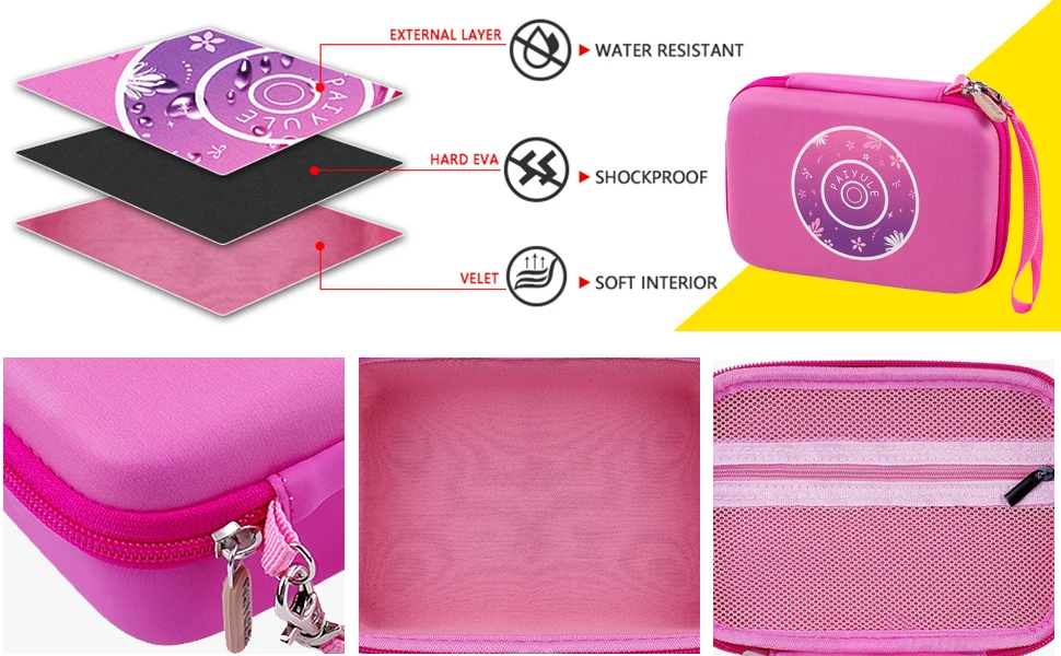 Преимущества товара: 1. Прочный твердый материал ЭВА и внешний слой из кожи. Ударопрочный и водонепроницаемый. 2. Розовый цвет, модный и игривый, полностью удовлетворяет невинность детей. 3. Компактный корпус и изящный дизайн, простота использования. 4. Прочная и гладкая молния с приятной строчкой, удобная, но не трудно достать и вытащить. 5. Сетчатый карман позволяет хранить аккумуляторы и другие аксессуары.