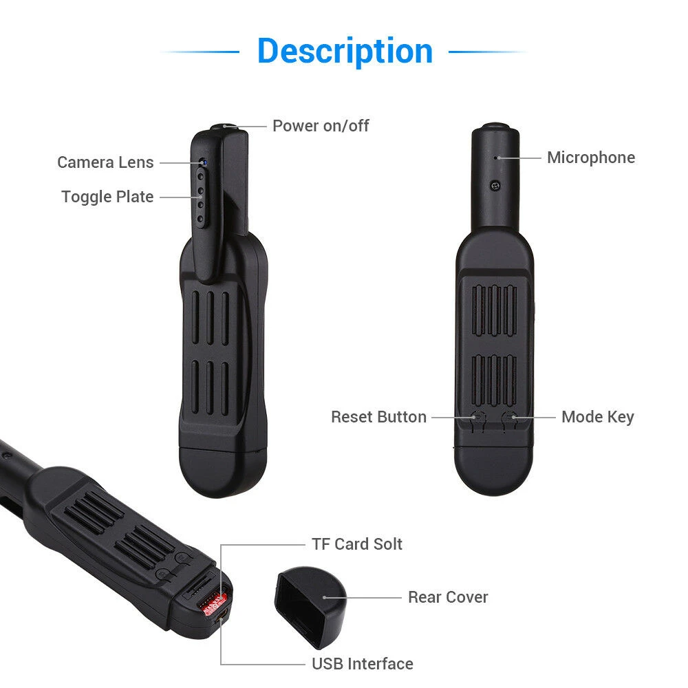 1080P шпионская Скрытая камера HD видео рекордер мини DV DVR широкоугольная спортивная видеокамера. Высокое качество изображения высокой четкости FULL HD1080P DV DC Компактный дизайн, Портативный DV DC 【Видео камера 】 1920*1080P; Поддержка 6 часов непрерывного видео-рекордера. [Шпионская камера] это очень скрыто; В режиме реального времени видеорегистратор. Вы можете использовать его в качестве скрытого видеозаписывающего устройства в кармане, чтобы тайно записывать живые разговора, не осознавая этого. 【MINI DV】 это мини DV камера, поддержка снимков; Поддержка ТВ-выхода. 【Время работы аккумулятора составляет 6 часов; Время зарядки-3 часа; Поддержка записи и одновременной зарядки. 【Карта памяти 】 поддержка макс. 16/32 Гб Micro SD-карты. Формат видео для: 1280x720P Формат видео для: 1920x1080P Режим для фотографирования: 12 МП (4032x3024) Интерфейс USB 2,0 высокоскоростной передачи Внешний слот карты micro sd (поддержка макс. 16/32 Гб micro sd карты) Поддержка TV OUT TV monitor video connection Встроенная литиевая батарея устойчивая камера до 360 минут (6 часов)