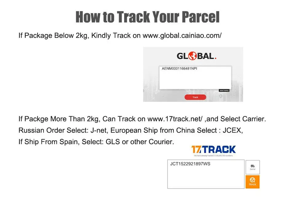 Как отследить вашу посылку Если упаковка ниже 2 кг, пожалуйста, Отслеживайте на www.global.cainiao.com/ Если упаковывается более 2 кг, можно отслеживать на www.17track.net/и выбрать перевозчика. Выбор российского заказа: J-net, Европейский корабль из Китая Выберите: JCEX, Если доставка из Испании, выберите: GLS или другой курьер.