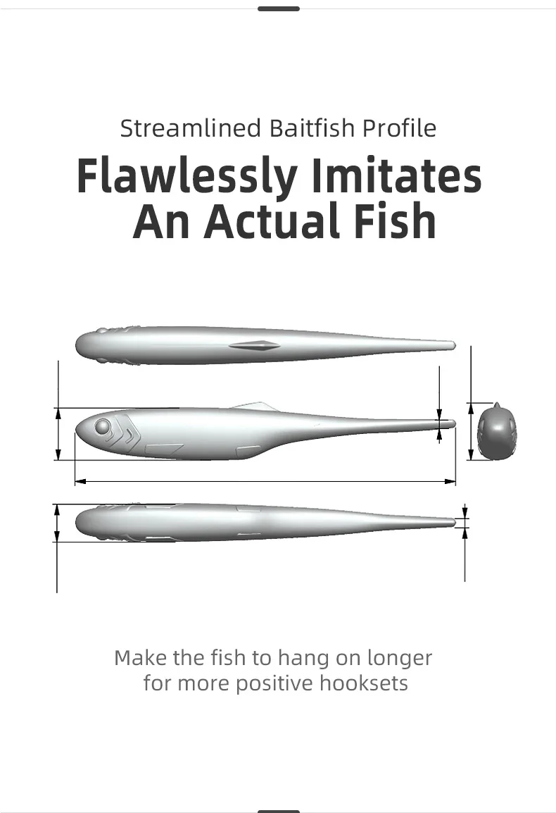 Дизайн с тонким хвостом добавляет темное действие через воду, как испуганная или травмированная приманка, кажется, оживает в небольшом токе, вызывает агрессивные реакции кормления от басов и других рыб