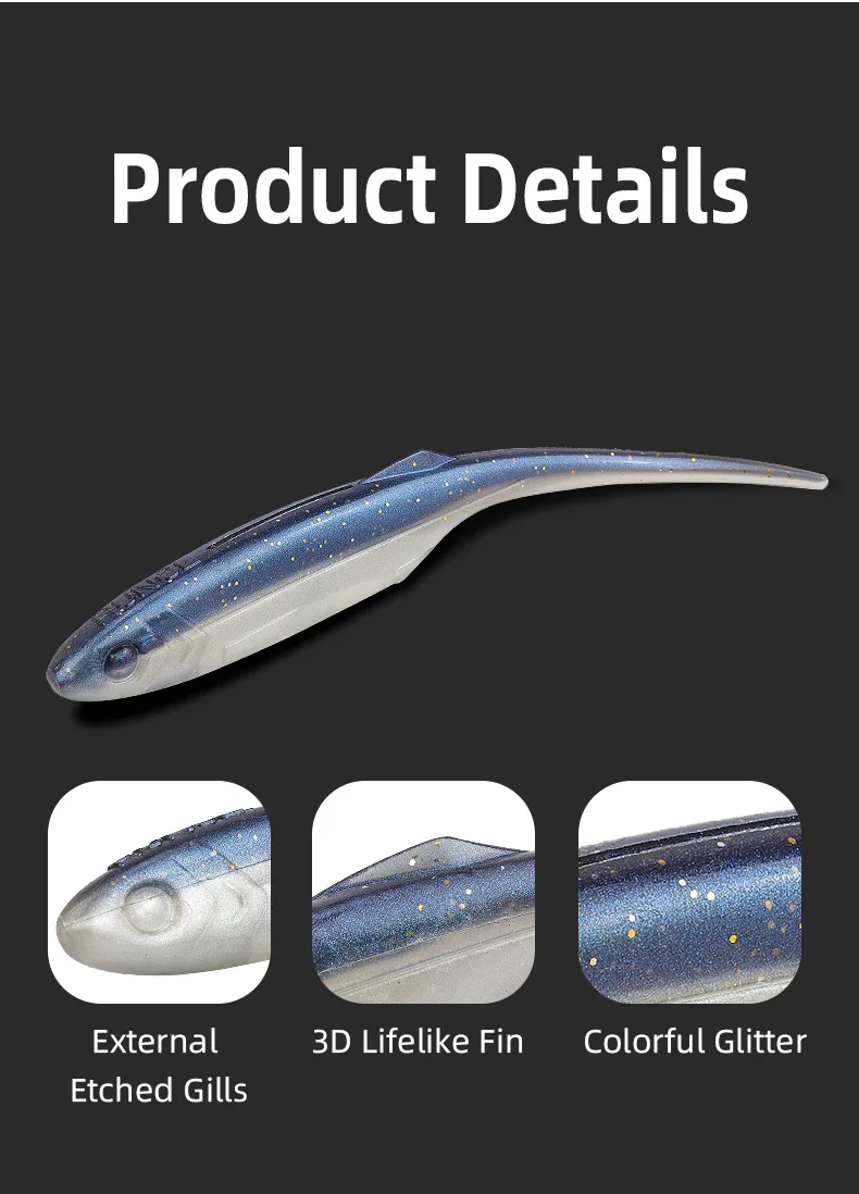 Мягкая приманка для рывков имеет обтекаемый профиль приманки с внешними травлеными жабрами, реалистичный объемный плавник и глаза, живой тонкий хвост, безупречно имитирует настоящую рыбу, помогает рыболовам притягивать большие улова