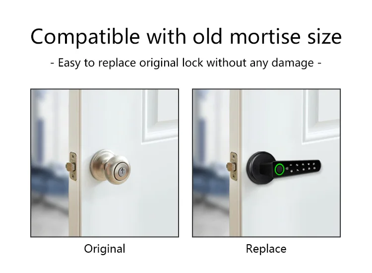 Bluetooth Unlock Fingeprint Unlock Password Unlock Max support 100pcs fingeprint user Max support 100pcs password ●Door thickness: 35mm~55mm ●Zinc Alloy material durable and secure. ●Easy to replace Original lock ●Universal for Left or Right door direction