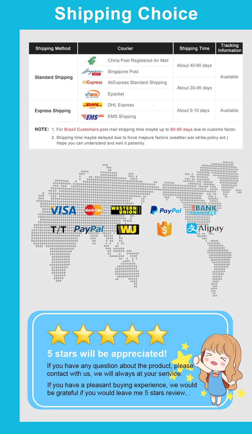 • Уважаемый покупатель, пожалуйста, оставьте нам пять звезд положительный отзывы, если вы удовлетворены нашей продукцией.