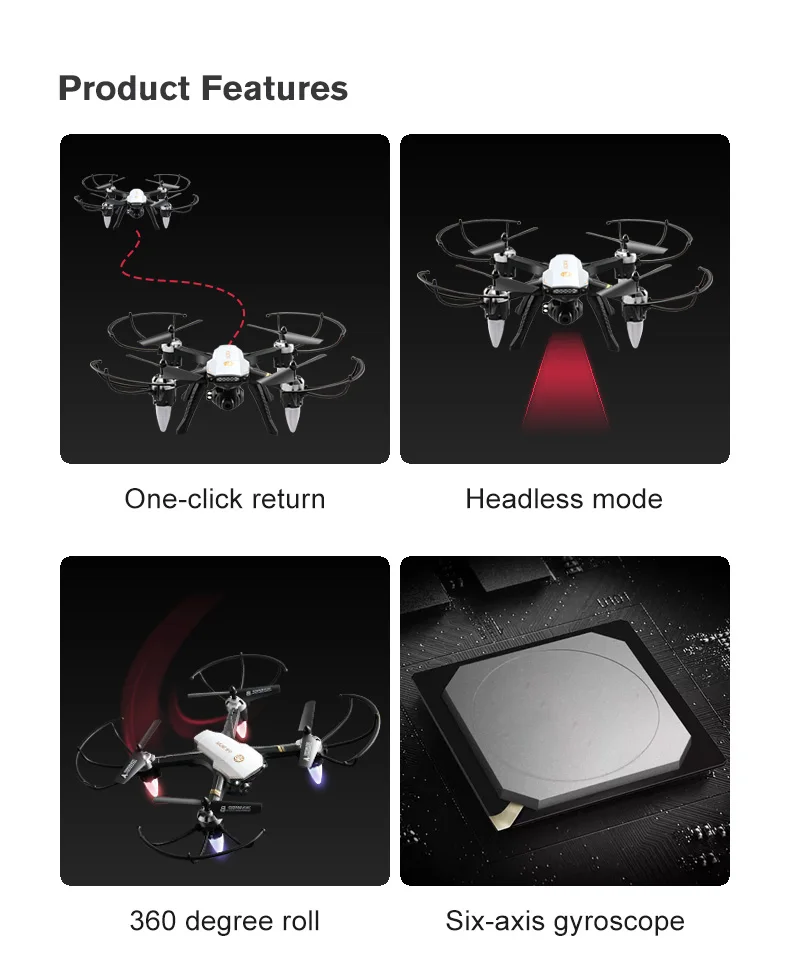Подъем и спуск, вперед и назад, поворот влево и вправо, освещение, Безголовый режим, возврат одной кнопкой, рулон трюка, спиральный полет, такой же, как и выше, барометрическая установка высоты, Взлет/посадка одним ключом