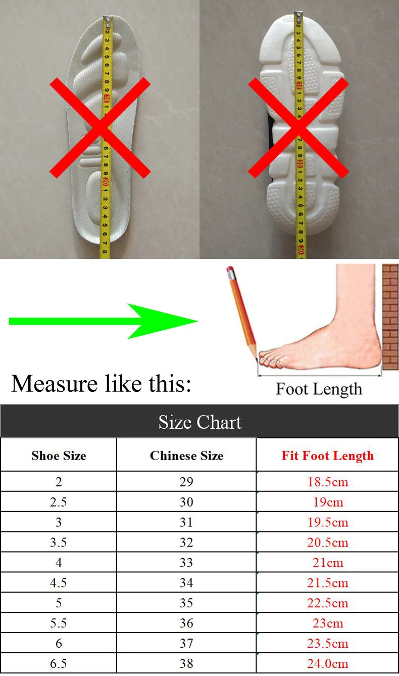 1. Китайский размер обуви отличается от вашей страны, в Китае, только длина стопы позволяет выбрать правильный размер обуви. 2. Не измеряйте длину обуви, не измеряйте длину стельки. 3. Зная точную длину вашей стопы, выберите размер из нашей таблицы размеров, если ваша стопа широкая или толстая, чем обычно, на один размер больше. 4. После того, как мы отправим вашу обувь, пожалуйста, не забудьте отследить вашу посылку и забрать ее вовремя, или она будет уничтожена, если с течением времени. 5. Если у вас есть какие-либо вопросы, пожалуйста, свяжитесь с нами, мы хотели бы помочь вам.