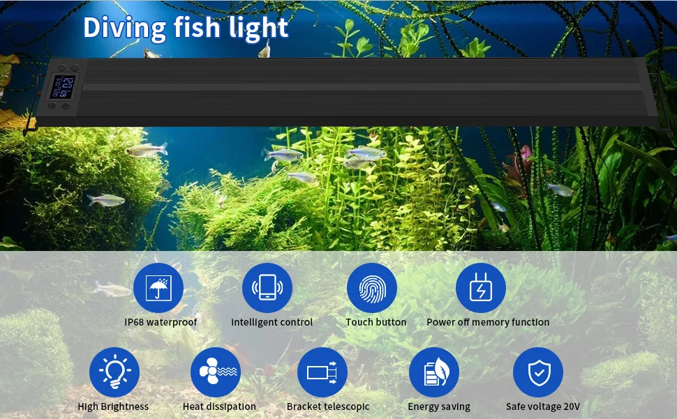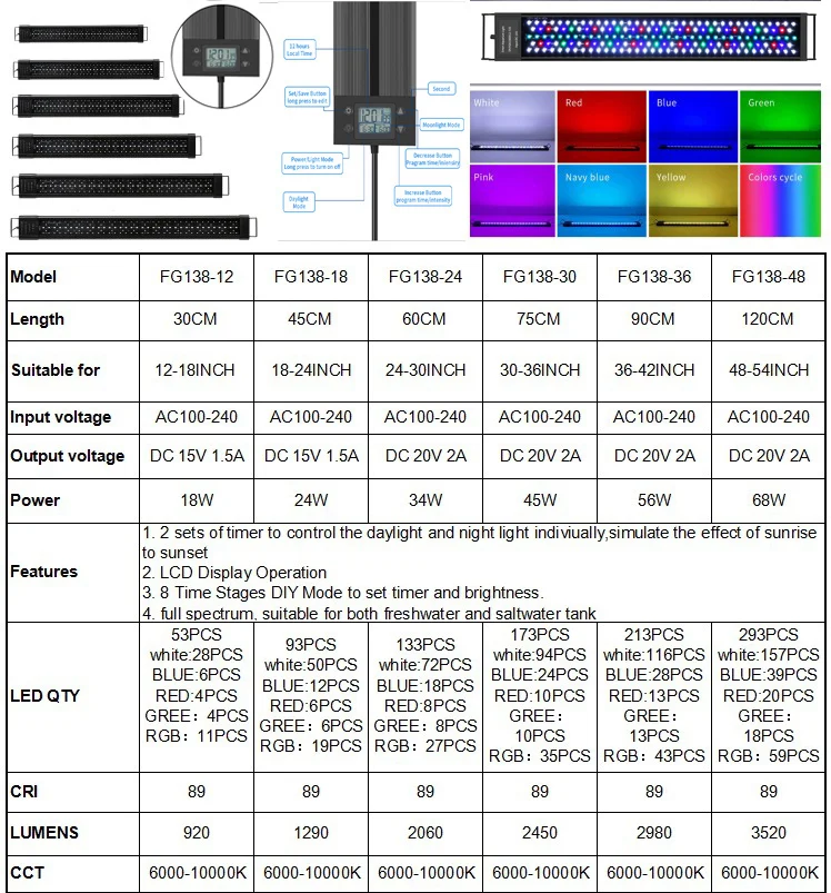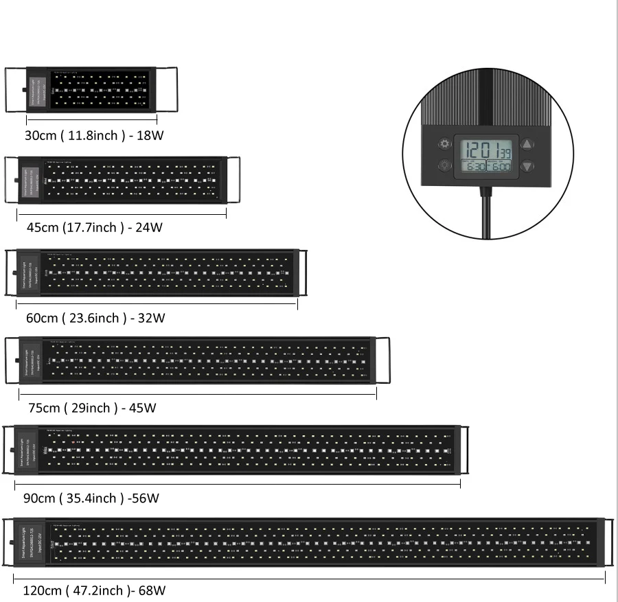 Особенности:* Программируемый дизайн с ЖК-монитором: ЖК-монитор имеет 2 канала, независимо управляя имитацией восхода и захода солнца* Супер яркий: ультра сильные светодиоды обеспечивают более чем достаточную яркость для просмотра* Регулируемый светильник, цвет и яркость: светодиодный светильник можно регулировать с десятью классами и подходит для различных требований к светильник, он также может быть скорректирован с семью цветами.* Регулируемый таймер: светильник вкл/выкл регулируется на таймере.* Светодиоды без вспышки: качество светодиодов стабильное, а светодиоды не мерцают.* Высокотехнологичный ЖК-цифровой контроллер дисплея, легко устанавливается и проверяется цвет и яркость аквариума рыбный светильник. IP65 Водонепроницаемый и легко моется и протирается, нет ничего страшного, когда огни аквариума выпадают в воду в течение короткого времени.