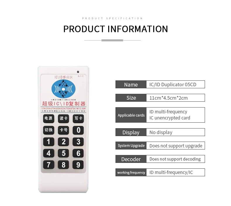Устройство поддерживает только зашифрованную карту 125 кГц, 250 кГц, 375 кГц, 500 кГц, 13,56 МГц (режим Ic)