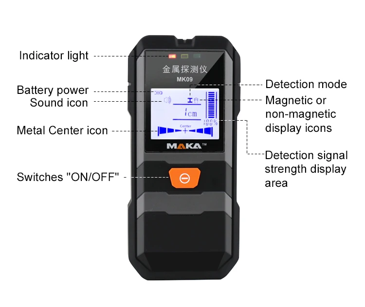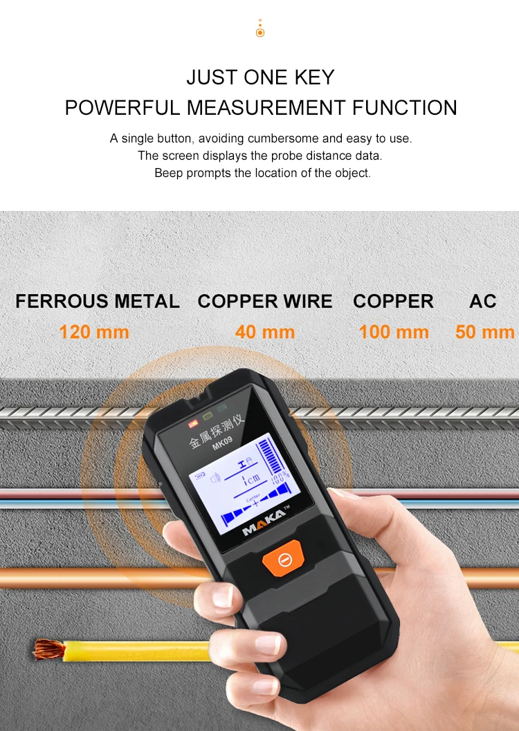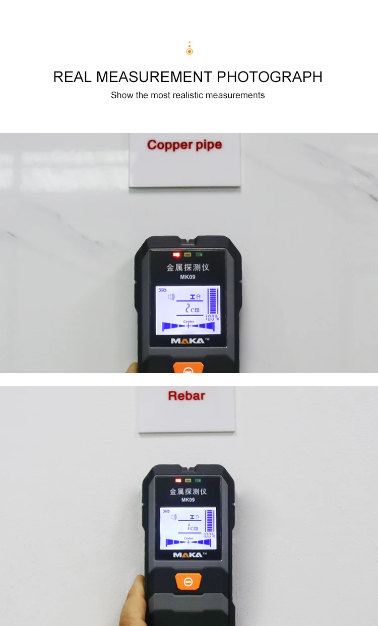 Этот детектор может обнаруживать металлы (стальные стержни, медные трубы и т. Д.) и кабели, скрытые в стенах, потолках и полах.