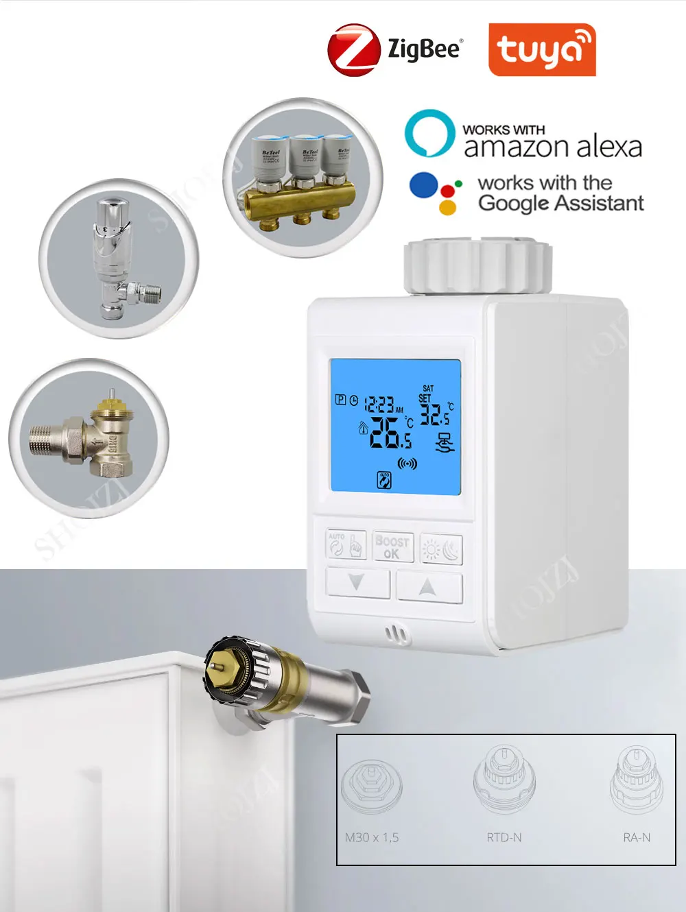 Термостатический радиатор-это специальный клапан, используемый в сочетании с нагревательным радиатором. Смарт-Tuya ZigBee термостат для радиатора: термостат для радиатора 1,6 дюйма с синей подсветкой ЖК-дисплей экран дисплея и 5 кнопок делают чтение и настройка значения в темное время суток проще с ЖК-дисплей цифровым дисплеем. Он состоит из трех батарей AA и является специальным клапаном, используемым в сочетании с радиаторами. Внутренняя температура устанавливается искусственно, что в основном используется в системе отопления пола для контроля закрытия и открытия труб. Поток через радиатор можно регулировать без внешней горячей воды для достижения постоянной комнатной температуры. Непосредственно Управляйте водяным клапаном без установки привода и клапана контроля температуры. Подходит для электрической части привода электрического отопления ветрового клапана, небольшого клапана и динамического балансирующего клапана. Метод установки гайки прост и прост в установке и легко разбирается.
