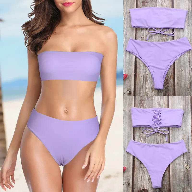 Женский купальник-бикини со шнуровкой на спине, бандо с высокой талией, купальник с высокой посадкой