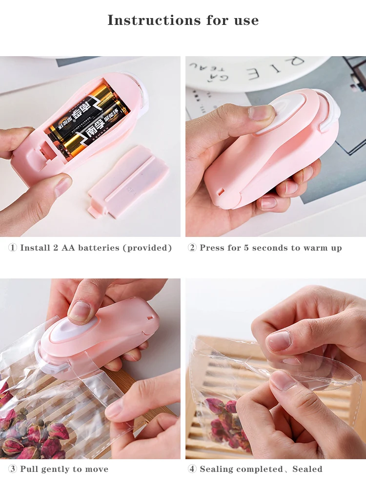 Kinldy Notes Please Insert 2 AA batteries (not included) and "+" "-"marks can see, make sure batteries face the right way. Perfect to Keep the Freshness Perfect reseal unused portions of food, snack, seasoning, ingredients in plastic bags. Working Principle Heating to melt plastic bag. After putting the batteries, please preheat the sealer by pressing 5 seconds before use.
