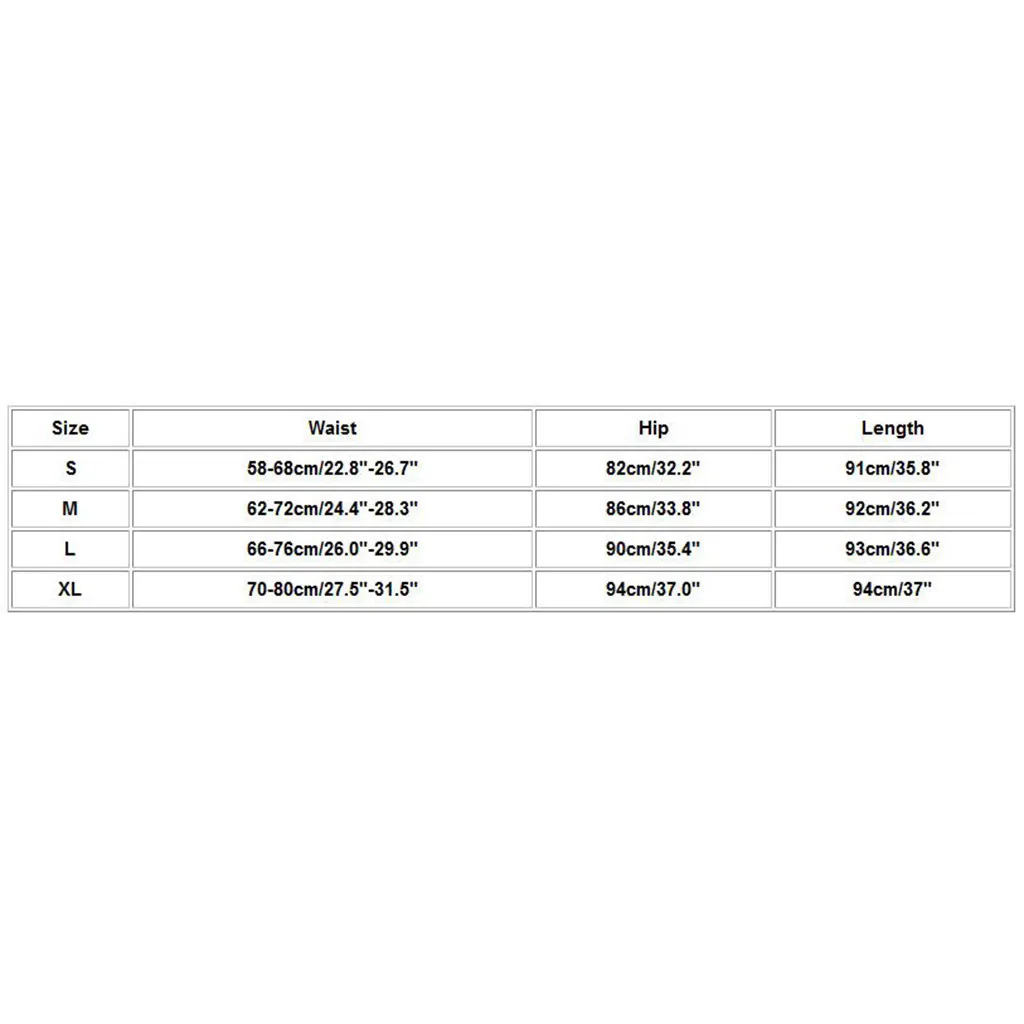 Size Waist Hip Length S 58-68cm/22.8"-26.7" 82cm/32.2" 91cm/35.8" M 62-72cm/24.4"-28.3" 86cm/33.8" 92cm/36.2" L 66-76cm/26.0"-29.9" 90cm/35.4" 93cm/36.6" XL 70-80cm/27.5"-31.5" 94cm/37.0" 94cm/37"