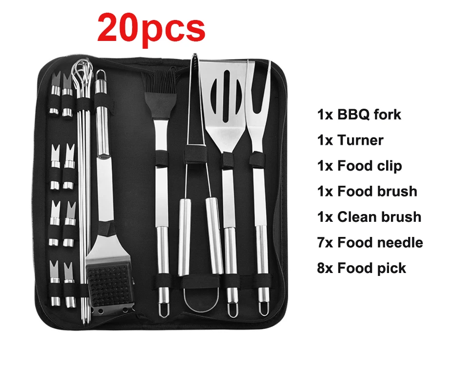 20 шт. в комплекте: 8 шпажек, 7 шпажек круглой формы, 1 проволочная щетка, 1 длинная ручная щетка, 1 щипцы, 1 лопатка, 1 вилка