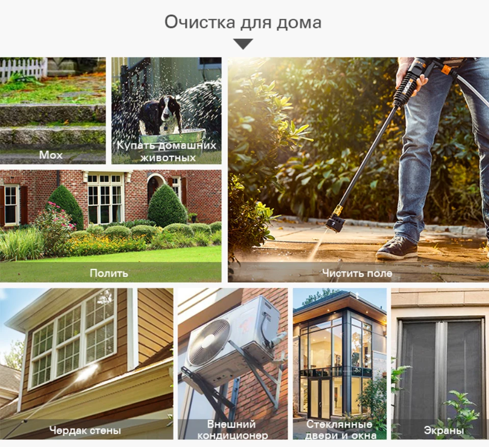 - Мойка высокого давления, больше не ограничена питанием и источником воды, беспроводная Чистка в любое время и в любом месте. - Самовсасывающий давление до 25 бар, 4,4 раз воды крана, диапазон для 6-7 м, без давления для мытья пола - Компакный корпус, не занимая земли - 20 В высокоэнергетическая аккумуляторная литиевая батарея, длительный срок службы и быстрая зарядка. - Многофункциональное применение, для домашнего использования, для использования на улице - Легкая установка в два шага - 5 в 1 многофункциональная насадка, 5 видов типов выхода воды