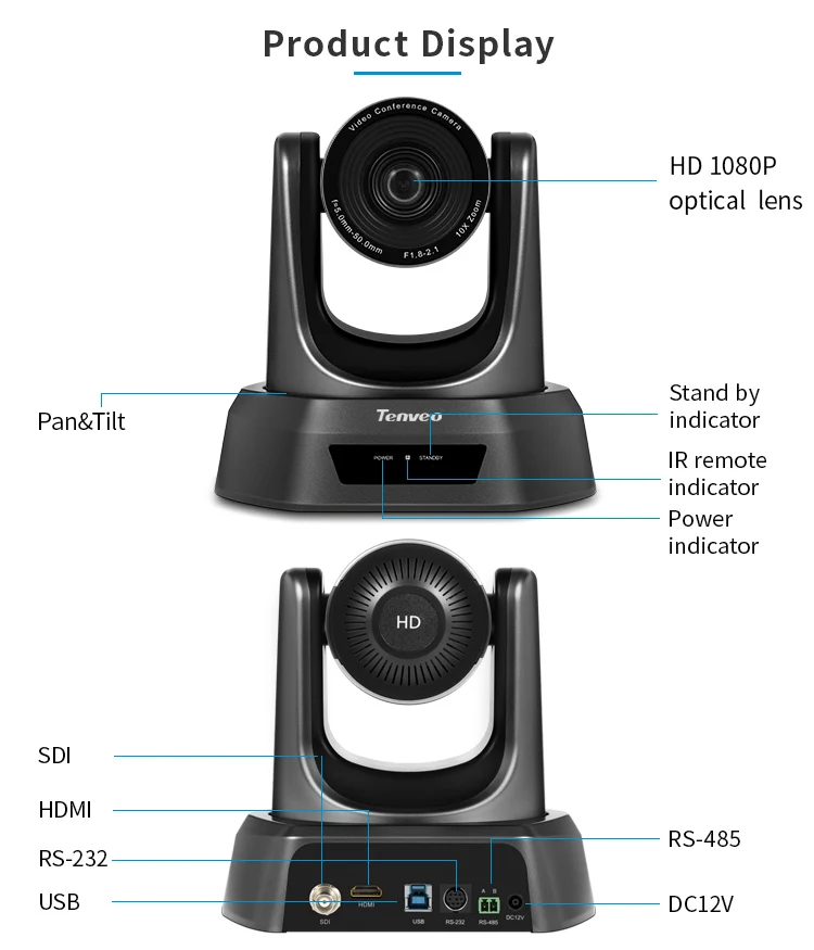 О: есть RS232, RS485 PTZ контроль, а также поддержка VISCA, PELCO-P, PELCO-D для управления через ваш кодек или ПК через RS232, и поддержка ИК-пульта дистанционного управления.