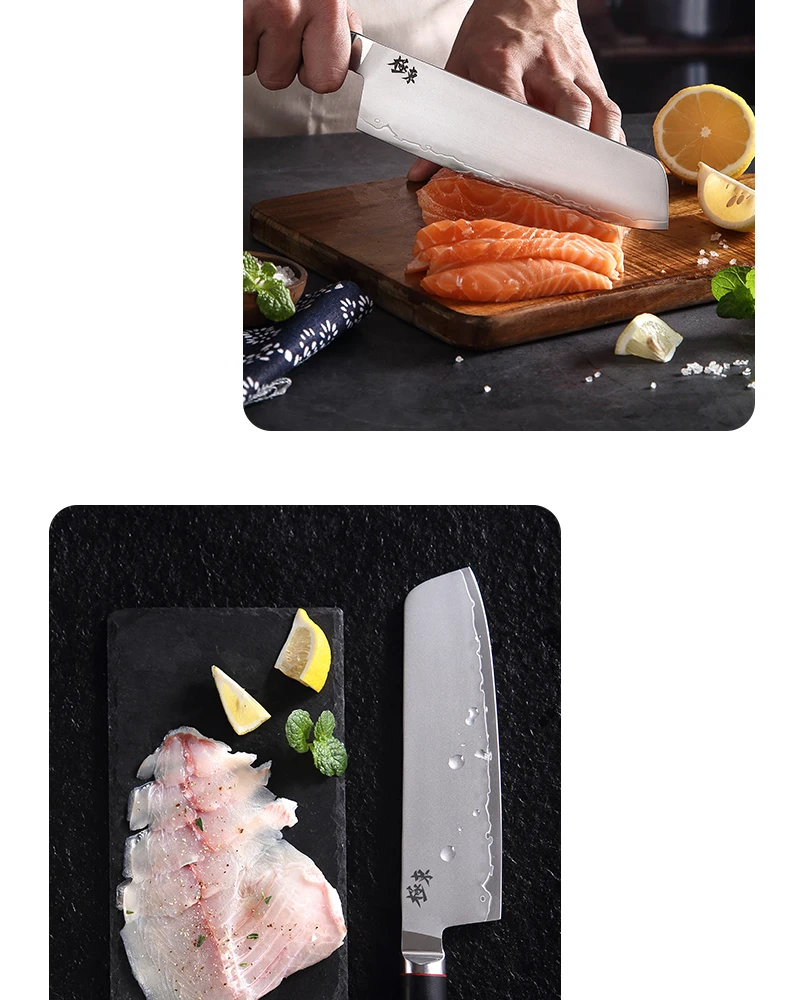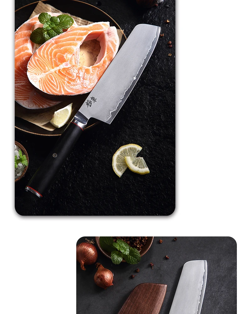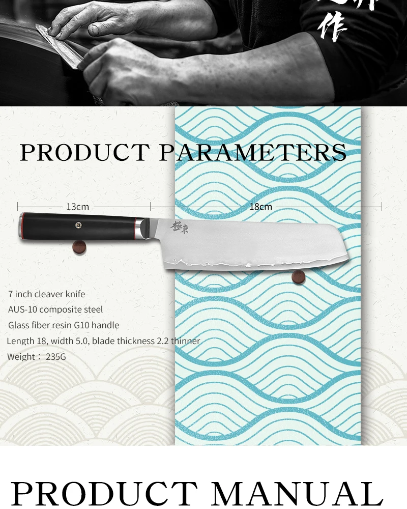 Пожалуйста, внимательно проверьте инструкции перед покупкой В 2021, последние 7 дюймов Тесак уже на рынке, и появление новую усовершенствованную модель немного отличается от старой модели. Пожалуйста, имейте в виду 1: В соответствии с приобретенным типом ножа, дайте ножны из цельного дерева Представление продукта 1: Этот продукт использует японскую AUS-10 Композитную сталь. Сталь с отличной производительностью может гарантировать твердость, твердость, остроту и долговечность кухонного ножа. 2: когда угол лезвия составляет 15 °, острый кухонный нож должен использоваться для обработки мелких кухонных ингредиентов. Высокие острые кухонные ножи не уничтожат мясистые волокна ингредиентов и вкус ингредиентов. Не раздавливает помидоры. Опасность тупых ножей намного превышает опасность острых ножей. 3: твердость стального сердечника кухонного ножа HRC60 ± 2. Высококачественная сталь может обеспечить стабильность твердости продукта и повысить долговечность. 4: продукт кованый из 3,5 мм Толстая стальная. После многих поковок, высокое качество пластика тела постепенно превратились в тоньше, сжимающийся из 2,2 мм до 1,7 мм, которые могут достичь резкость и уменьшить вес лезвия. 5: швейцарское авторитетное испытательное агентство SGS проверило продукт, содержание металла достигло стандарта, содержание углерода было 1.01%, содержание хрома было 14.9%, содержание молибдена было 0.90%, И содержание ванадия было 0.28%. Хорошая сталь является основой хорошего ножа 6: продукт был протестирован на соответствие стандарту бритвы ниже 100N, а средняя острота теста кухонного ножа составляет 210N. Специальная обработка может производить зеркальные края и кухонные ножи высокой четкости. 7: кованые ножи подчеркивают красивые волнистые линии лезвий, с великолепными сгоревшими линиями лезвий, как японские Seiko
