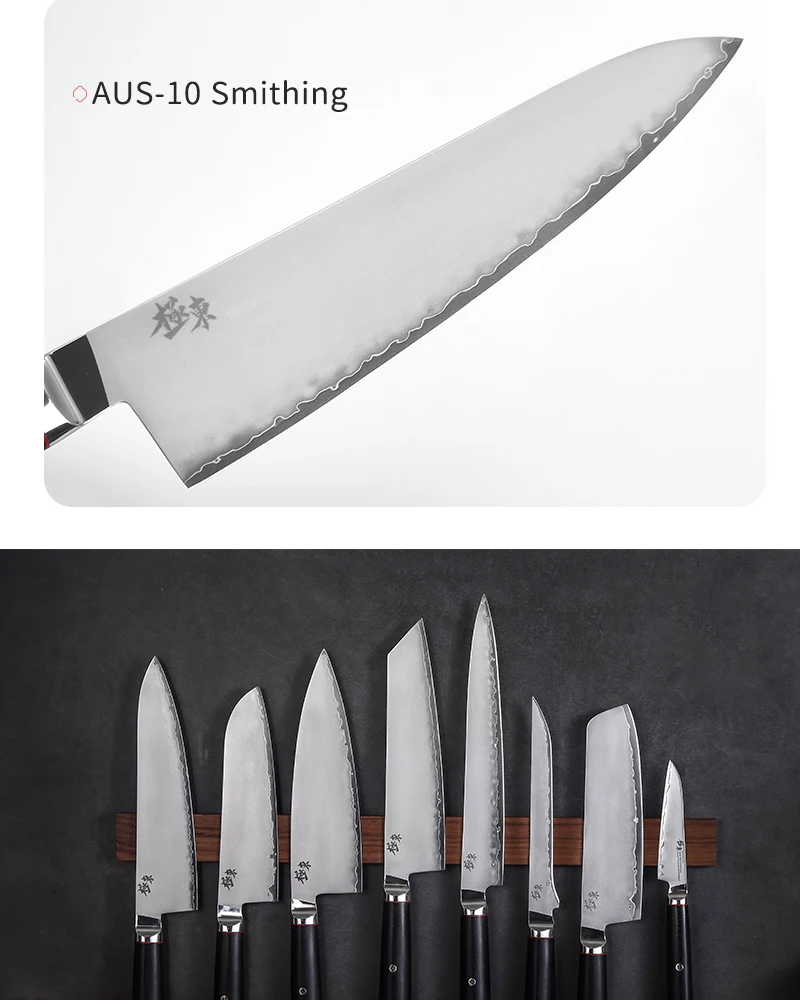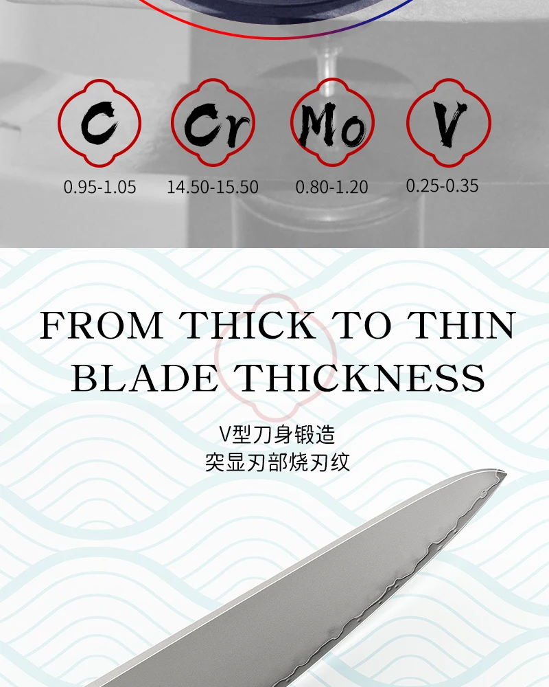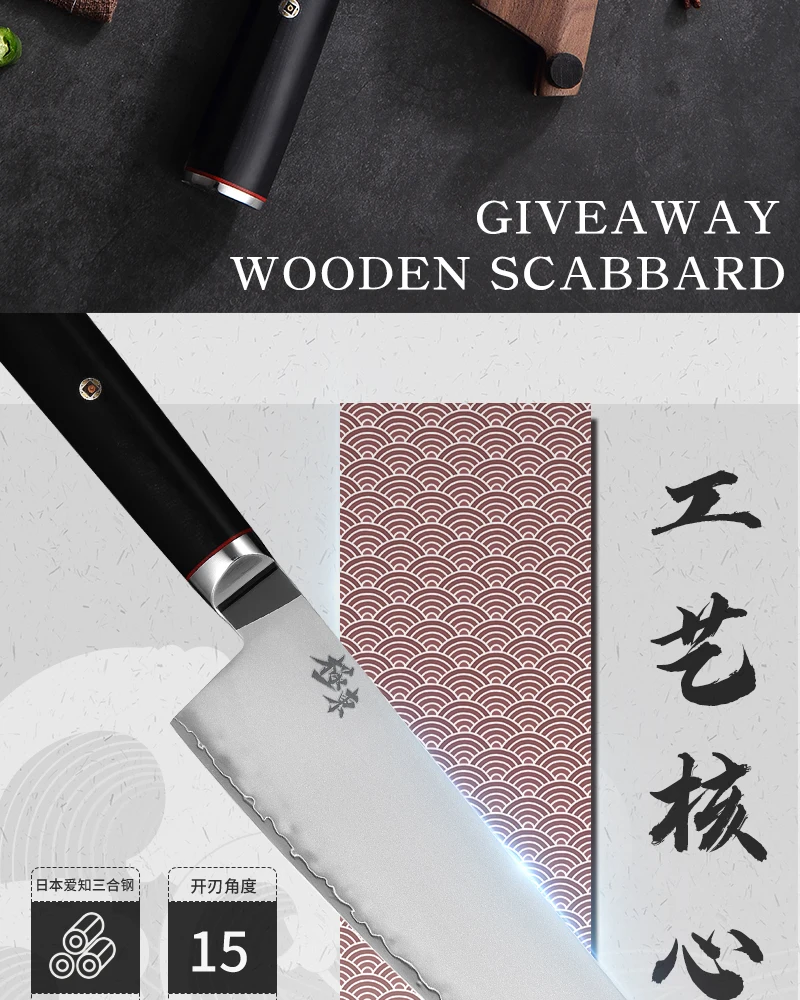 Пожалуйста, проверьте внимательно прочитайте инструкцию перед покупкой 1: в зависимости от приобретенного Тип ножа, дарят из цельного дерева ножнами Эксплуатационных характеристик продукта введение 1: Этот продукт использует японские AUS-10 многослойный стальной. Сталь с прекрасными рабочими характеристиками может гарантировать твердость, прочность, резкость и долговечность кухонных ножей. 2: в тех случаях, когда под углом наклона 15 °, sharp кухонный нож нужно использовать только для обработки точного кухня ингредиентов. Высокая sharp Кухонные ножи не разрушит мясистые волокон ингредиентов, ни вкус ингредиентов. Это никак не давит целых помидоров. Опасность тупить ножи намного превышает в sharp нож. 3: твердость кухонный нож стальной сердечник HRC60 ± 2. Высококачественной стали может обеспечить стабильность продукта Твердость и повышения долговечности. 4: продукт кованый из 3,5 мм Толстая стальная. После многих поковок, высокое качество пластика тела постепенно превратились в тоньше, сжимающийся из 2,2 мм до 1,7 мм, которые могут достичь резкость и уменьшить вес лезвия. 5: SGS Швейцарский авторитетным тестирования агентства тестирование продукта, содержание металлов в достиг стандарта, содержание углерода была 1.01%, содержание хрома был 14.9%, содержание молибдена был 0.90%, И содержания ванадия был 0.28%. Хорошая сталь является основой хороший нож 6: продукт был успешно прошли испытания на соответствие бритва Стандартный ниже 100N и средней резкости кухонный нож тест 210N. Специальная обработка может производить зеркало краями и высокой четкости кухонных ножей. 7: пройденное расстояние в кованые ножи подчеркнут красивый дизайном в виде волнистых линий лезвий, с шикарными сожженных лезвие линий Японии Seiko