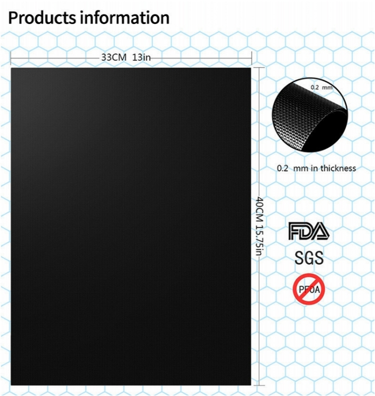 1. Термостойкость, может использоваться непрерывно в-70 ~ 260 °C Окружающая среда, мгновенное Температурное сопротивление 380 °C высокая температура; 2. Не липкий, с поверхностным покрытием PTFE, очень гладкий, не легко прилипает к пище; 3. Легко чистить, обычные бытовые чистящие средства могут быть очищены путем замачивания; 4. Длительный срок службы, может использоваться повторно много раз, по крайней мере 100 раз; 5. Размер: 40*30 см