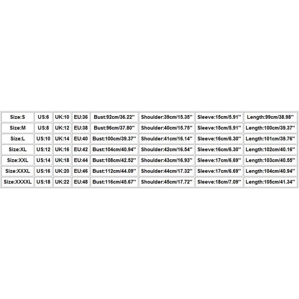 Size US UK EU Bust Shoulder Sleeve Length S 6 10 36 92cm/36.22'' 39cm/15.35'' 15cm/5.91'' 99cm/38.98'' M 8 12 38 96cm/37.80'' 40cm/15.75'' 15cm/5.91'' 100cm/39.37'' L 10 14 40 100cm/39.37'' 41cm/16.14'' 16cm/6.30'' 101cm/39.76'' XL 12 16 42 104cm/40.94'' 42cm/16.54'' 16cm/6.30'' 102cm/40.16'' XXL 14 18 44 108cm/42.52'' 43cm/16.93'' 17cm/6.69'' 103cm/40.55'' XXXL 16 20 46 112cm/44.09'' 44cm/17.32'' 17cm/6.69'' 104cm/40.94'' XXXXL 18 22 48 116cm/45.67'' 45cm/17.72'' 18cm/7.09'' 105cm/41.34''