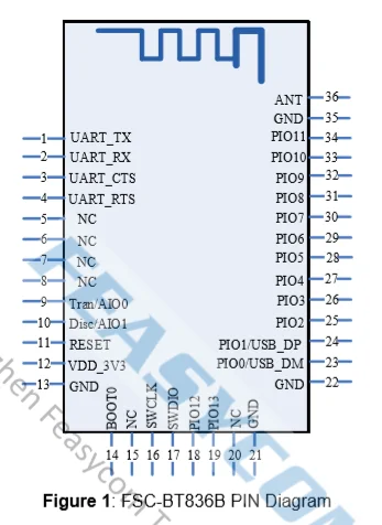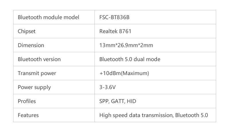 FSC-BT836B-это двухрежимный модуль Bluetooth 5,0 (BT 5,0 BR/EDR + LE), он поддерживает передачу данных через интерфейс UART, скорость передачи данных до 82KB/s, клиент может настроить параметры модуля через команды AT. FSC-BT836B Поддерживает SPP, GATT (Центральный/периферийный), HID профили, он может передавать данные в высокоскоростном режиме (SPP: 82KB/s, GATT: 65KB/s). FSC-BT836B также поддерживает несколько подключений (поддержка одновременного соединения с 1 смартфонами iOS + 7 на базе Android).