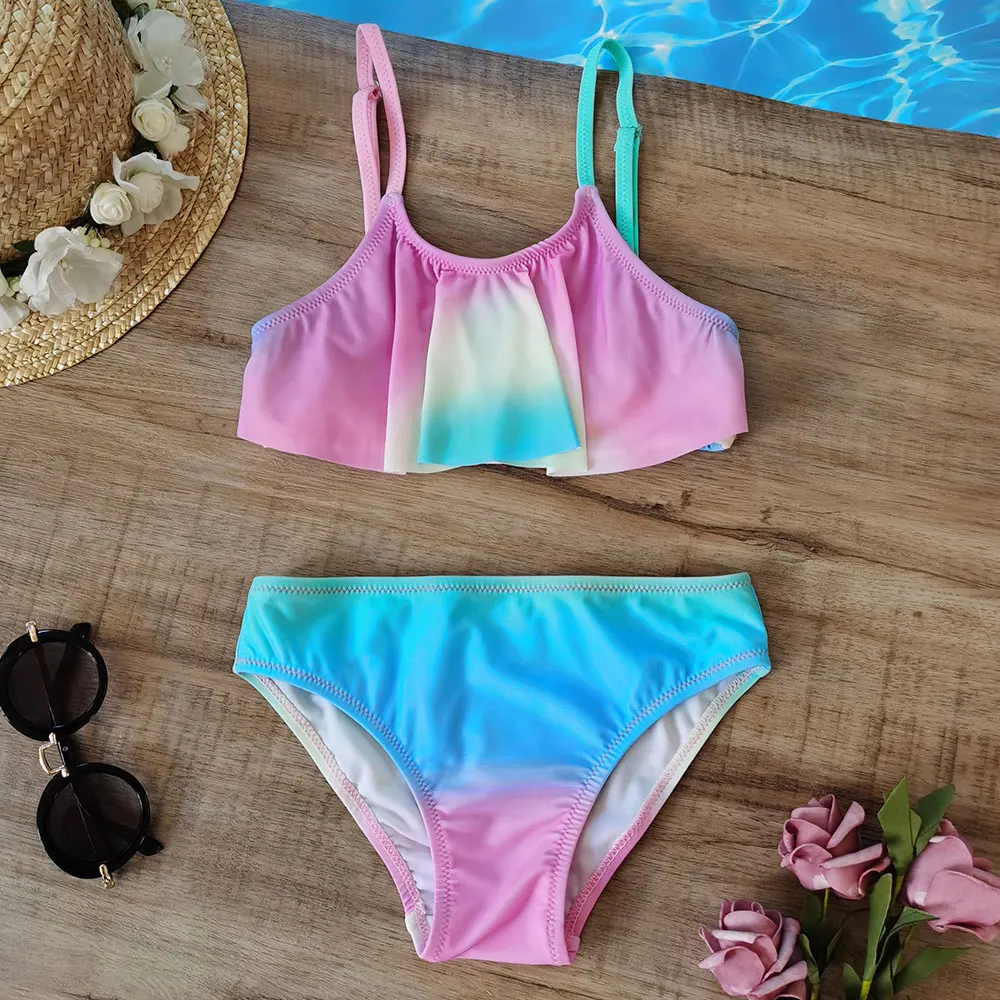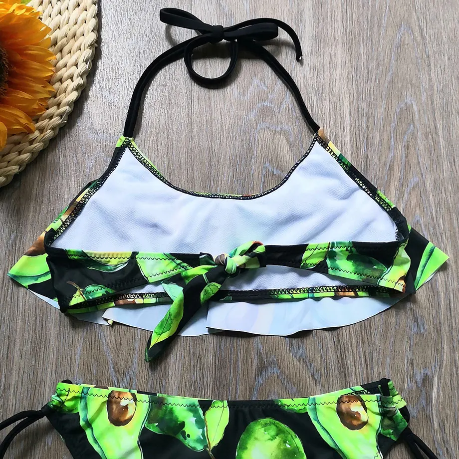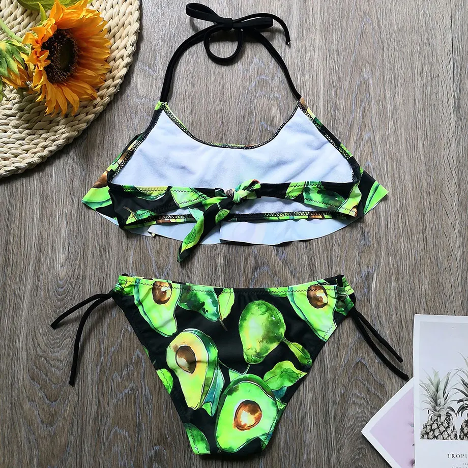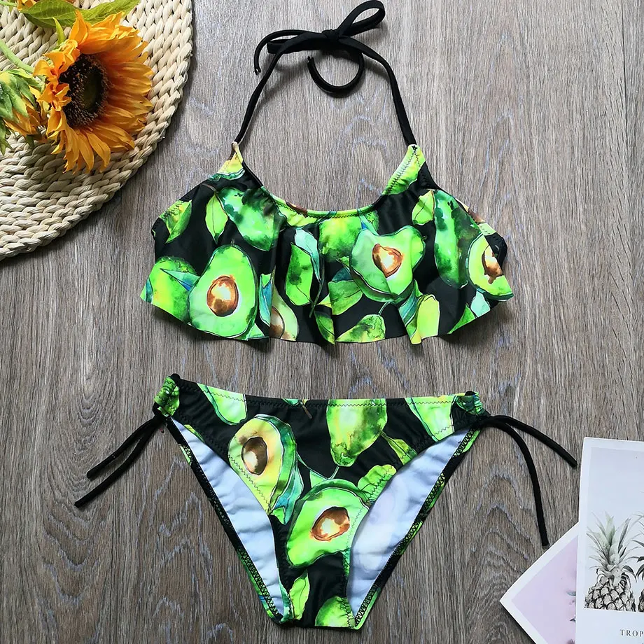 От 5 до 14 лет купальный костюм для девочек с тропическим принтом авокадо; Комплект бикини для девочек-подростков; Топ с лямкой на шее; Купальные костюмы для девочек; Детский купальник