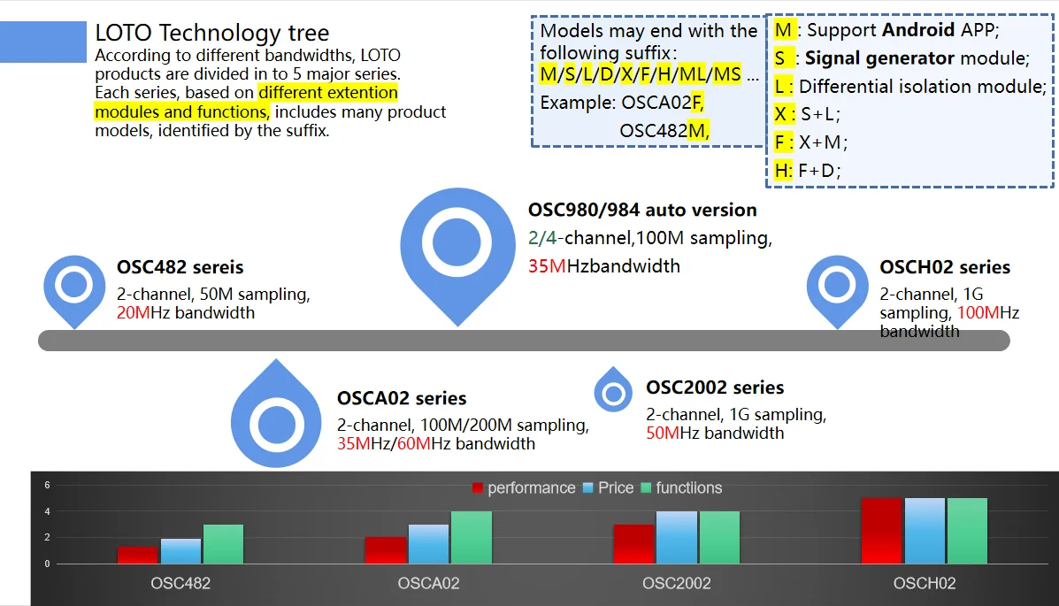 С осциллограф для ПК на основе осциллограф 482, вы можете совместить его с модулем генератора сигналов как осциллограф 482s, объединить модуль логического анализатора как осциллограф 482l или объединить оба модуля как осциллограф 482x. OSC482M-это OSC482 с поддержкой приложения android без модуля. Если вам нужен OSC482X с поддержкой приложения android, доступен OSC482F.