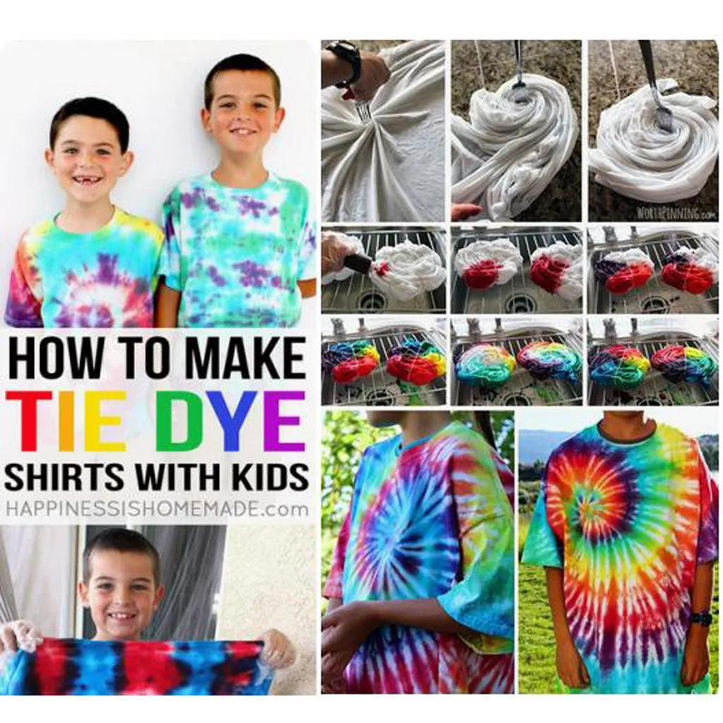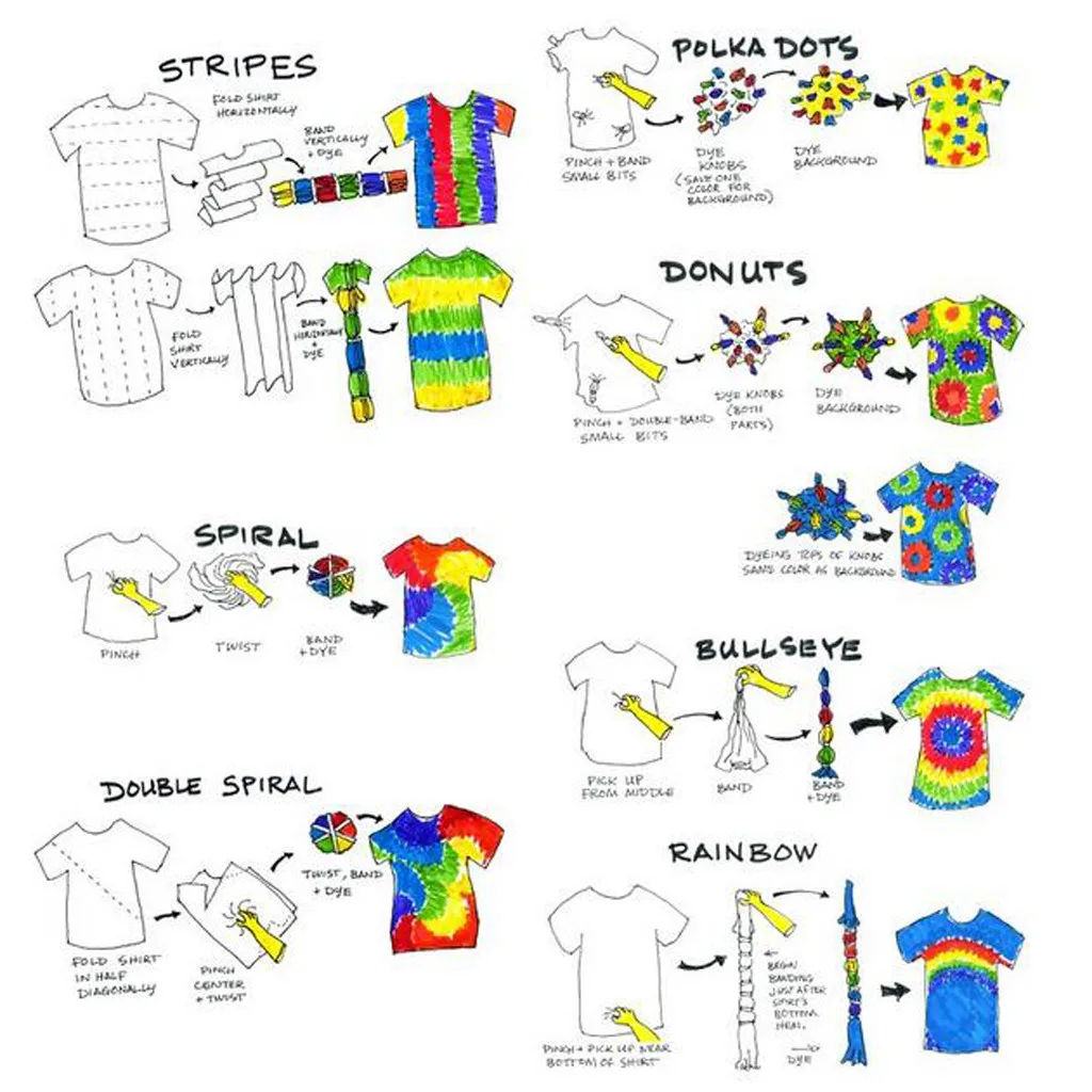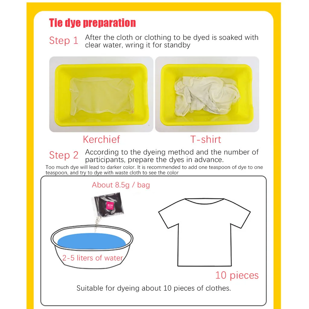 2. Широко используется, практичен и веселее. Если вы считаете, что ваша одежда слишком однообразна, вы также можете самостоятельно разработать модели. Вы можете попробовать одежду, сумки и шарфы.Посылка: 1 шт.Набор Tie-dye (5 бутылок tie-dye, 1 бутылка-спрей, 5 дополнительных красителей (голубой, желтый, небесно-голубой, оранжевый, фуксия),2 скатерти, 2 небольшие ложечки, 20 резиновых лент, 8 перчаток)
