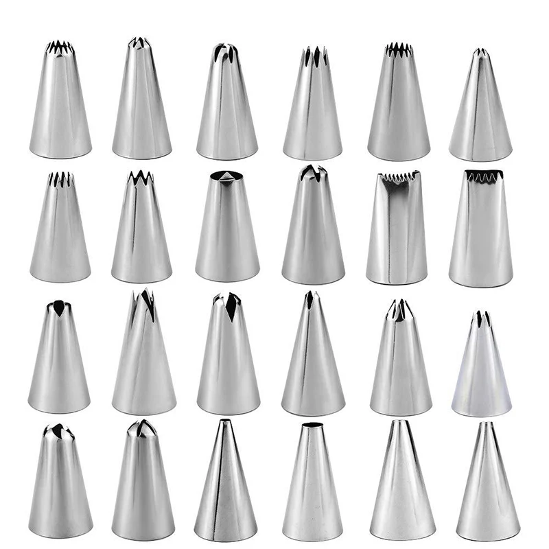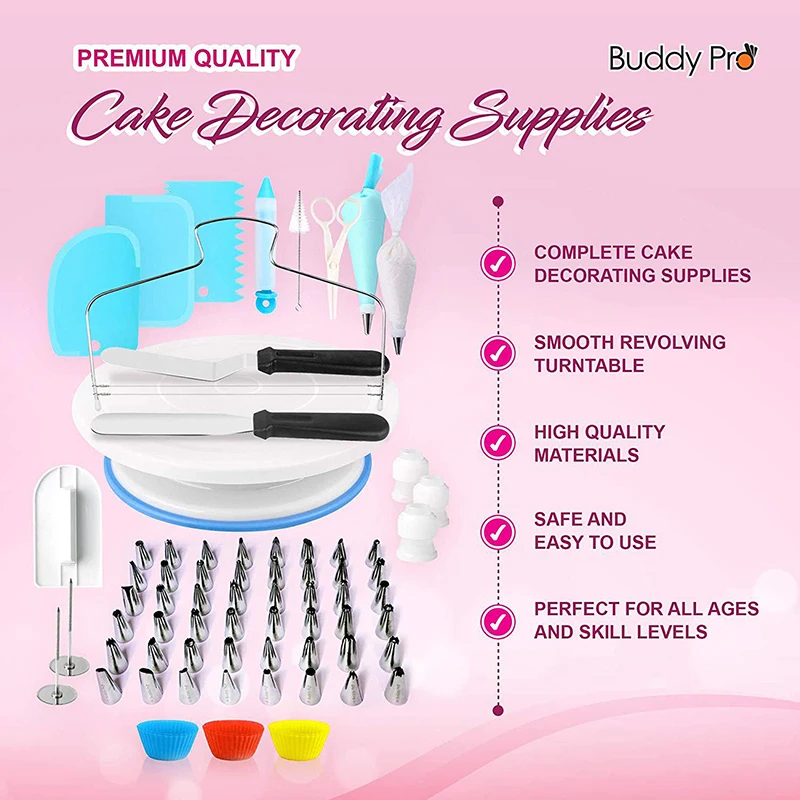 1 non-slip cake turntable 1 plastic curved spatula-(27cm) 1 plastic straight spatula (27cm) 48 heads 1 layerer 1 set of blue scrapers 1 12 inch TPU decorating bag 2-30 100 regular disposable bags 1 white trowel 3 small converters 2 small flower nails 1 regular decorating scissors 1 umbrella brush 1 blue silicone decoration pen 6 silicone cups 2 blue 2 yellow 2 red 1 plastic box with 48 heads