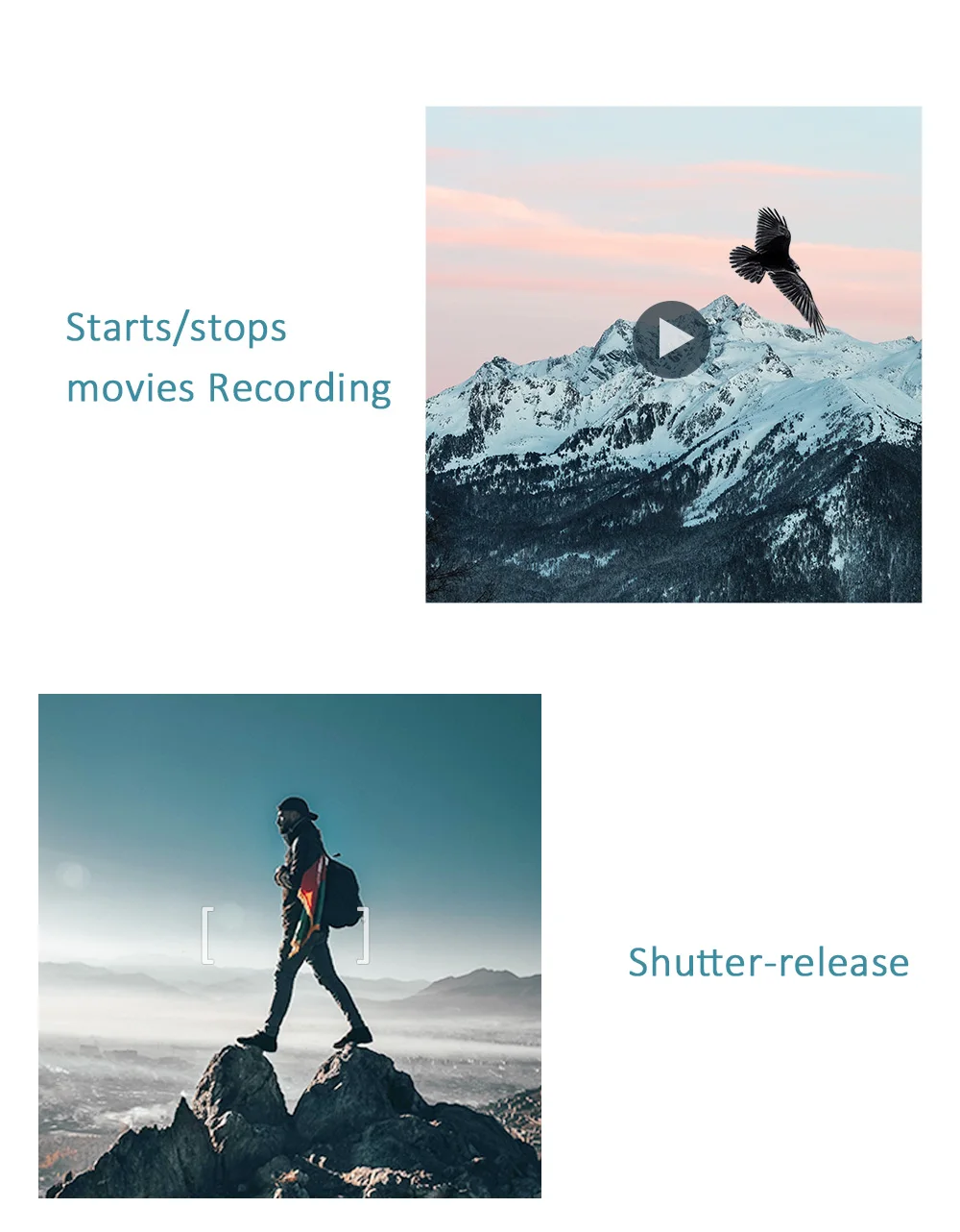 В комплект входит кнопка спуска затвора: функции аналогичны кнопке спуска затвора на камере. Нажмите кнопку спуска затвора, чтобы сделать фотографии. При использовании функции автоспуска вы можете нажать кнопку, чтобы отменить съемку во время обратного отсчета. Кнопка записи фильмов: запуск/остановка записи фильмов.