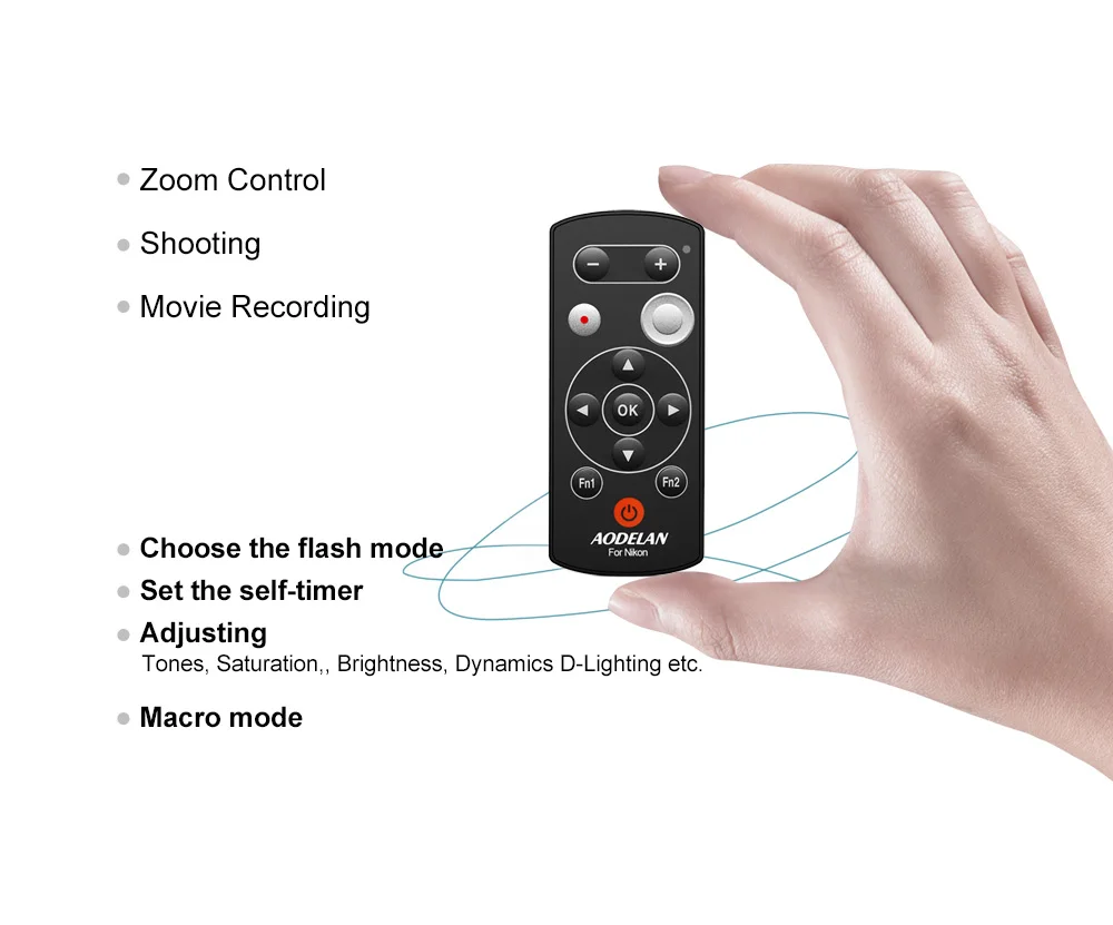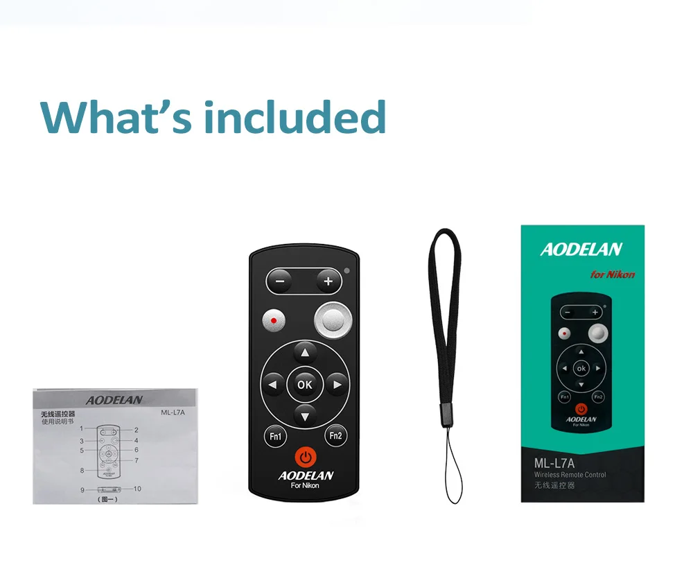Беспроводной пульт дистанционного управления AODELAN ML-L7A позволяет беспроводному спуску затвора камеры в диапазоне 32,8 '. Вы можете выполнять Удаленные операции, такие как Запись фильмов или фотографирование, подключив ML-L7A пульт дистанционного управления к камере.