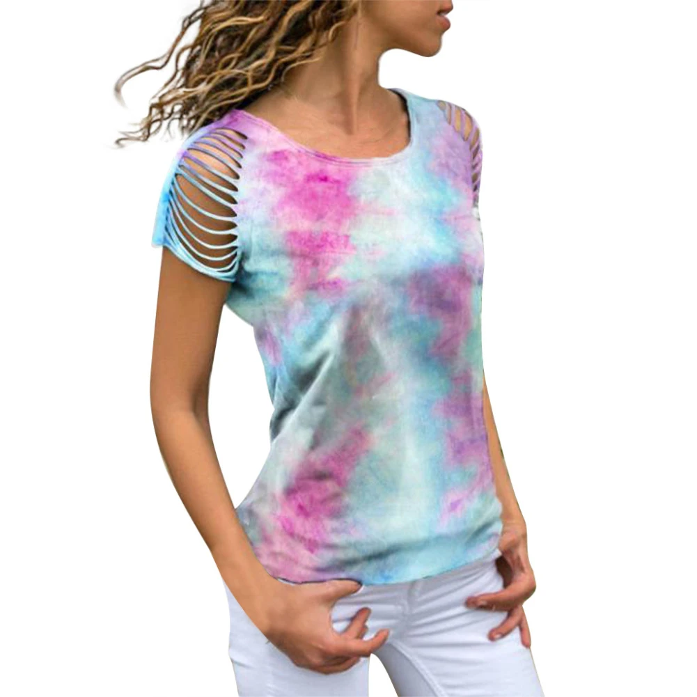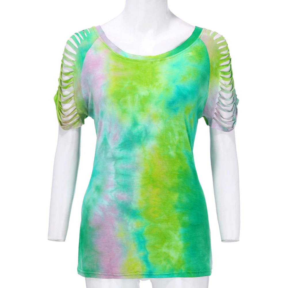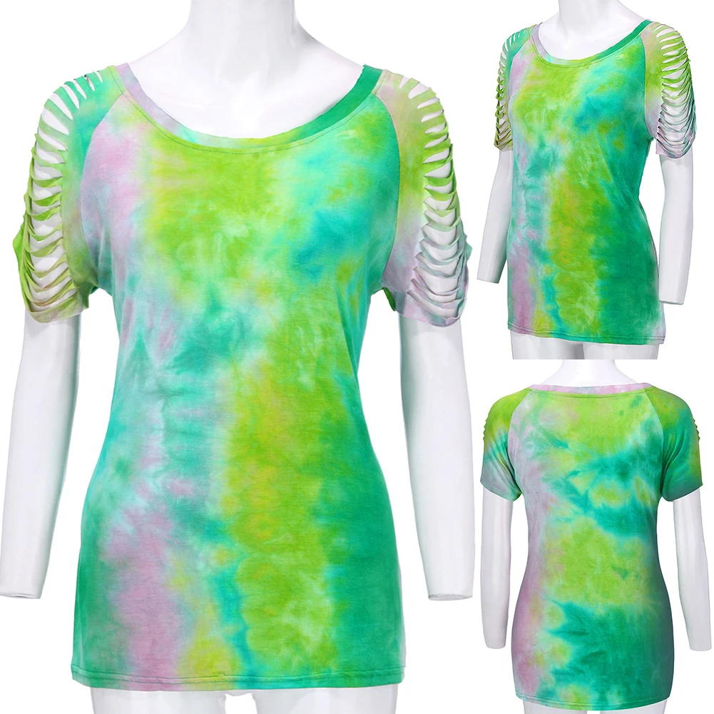 Женская модная летняя футболка с круглым вырезом и коротким рваным рукавом, блузка с принтом красителя