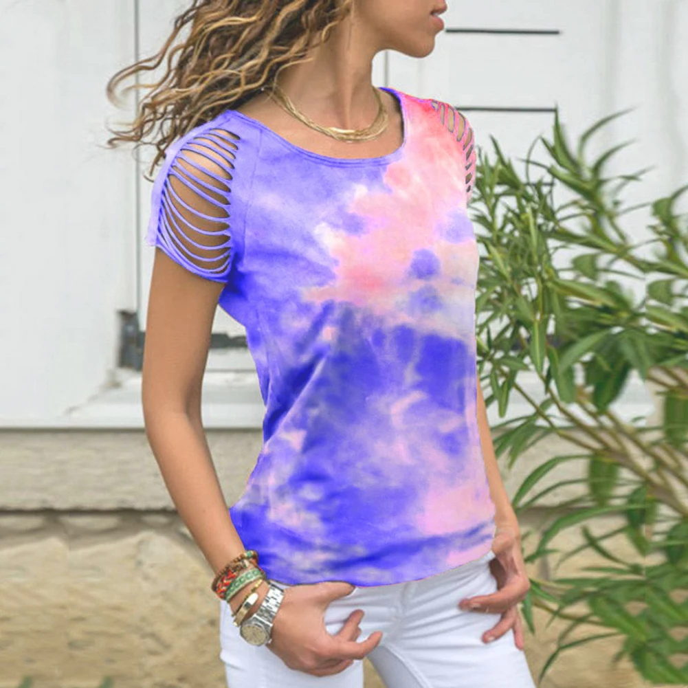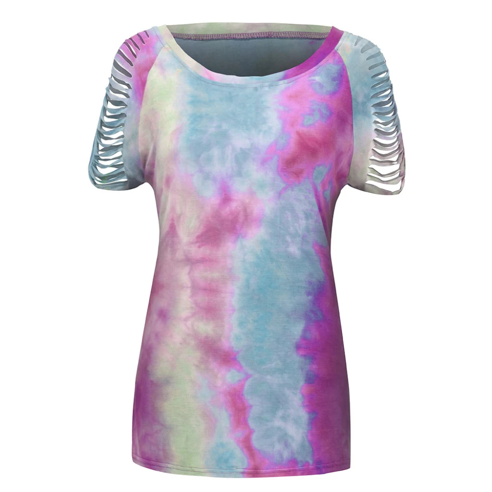 Блузка с принтом в виде галстука-красителя представлена с рваными рукавами, что делает вас привлекательной и модной.