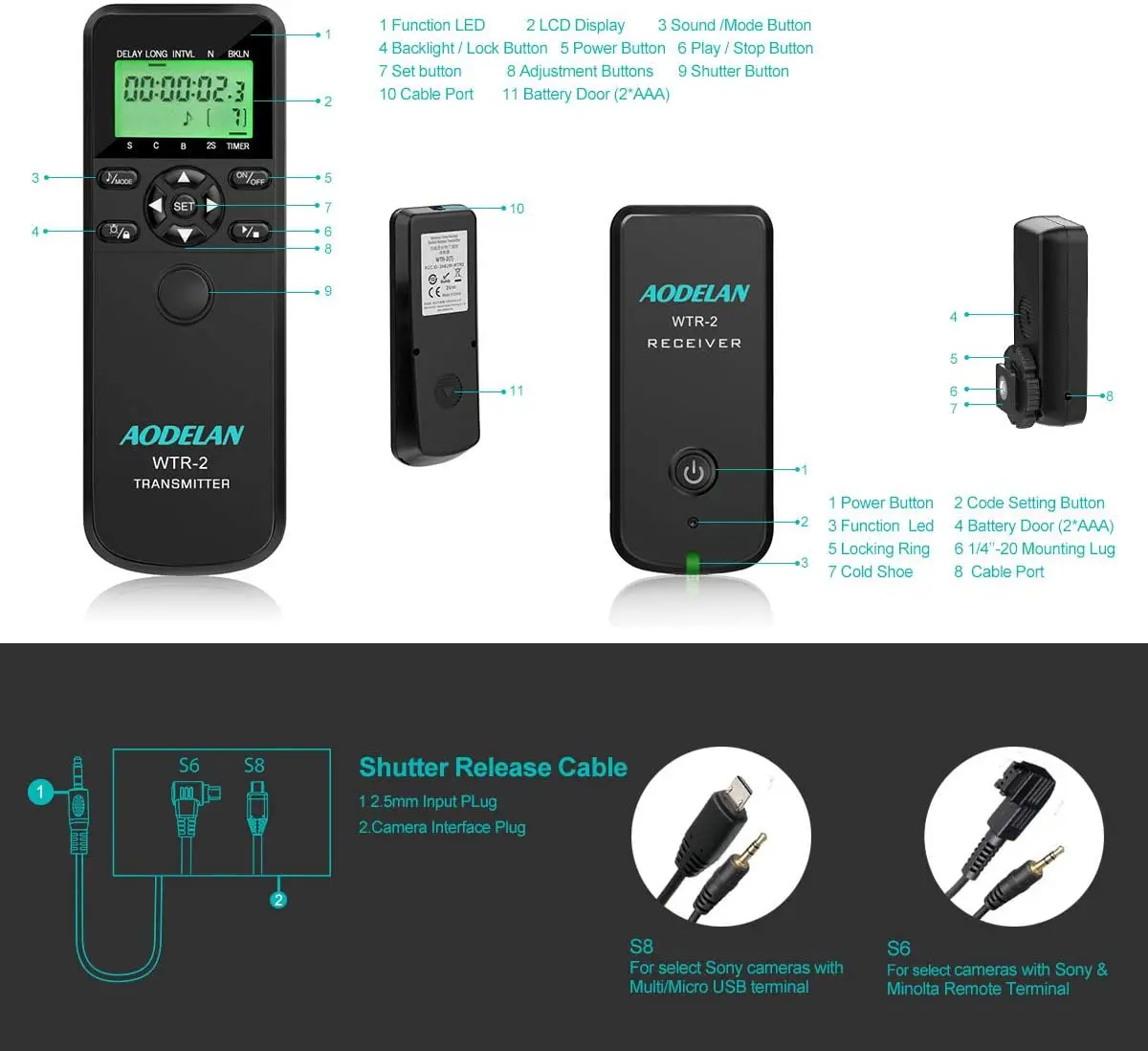 WTR-2 AODELAN будет работать как таймер и дистанционный спуск затвора. Помимо полных функций спуска затвора, он также имеет функции размножения таймера: Таймер задержки, таймер длительного экспозиции, таймер интервала, а также настройки количества экспозиции; его временные параметры может быть с точностью до 0,1 секунд. WTR-2 отлично подходит для временной записи цветущих цветов, астрофотографии и т. д.